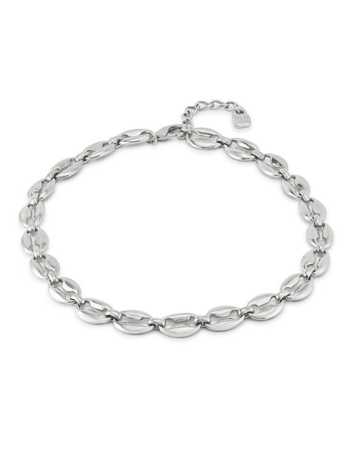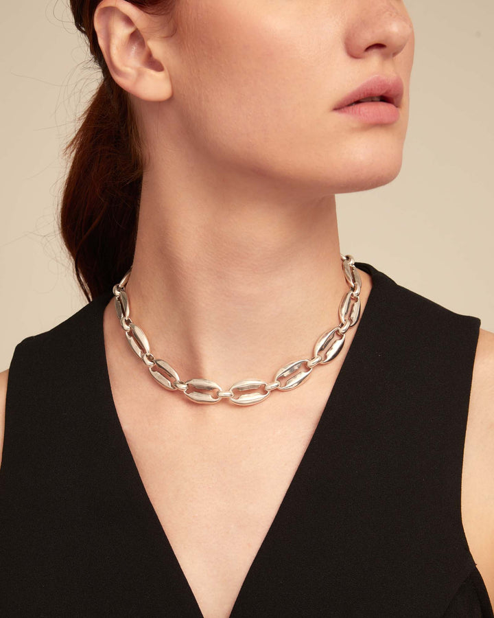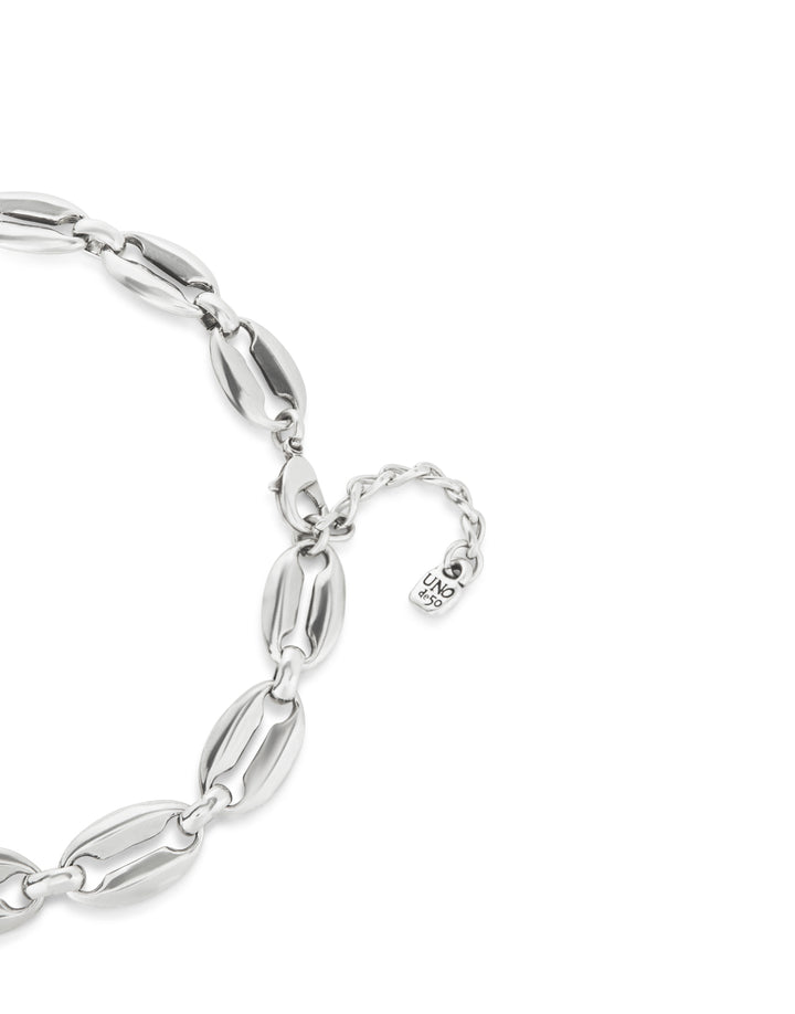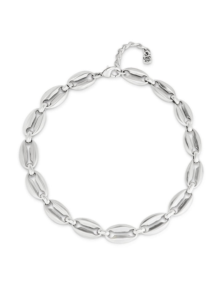 This Short link chain necklace by UNOde50 features mid-sized sterling silver-plated links inspired by seashell forms, reflecting the Thankful collection’s connection to nature and gratitude. Handmade in Spain, it celebrates rebirth, prosperity, and protection of personality. Versatile and contemporary, it can be worn layered or alone. The artisanal craftsmanship highlights quality and individuality, while the nature-inspired design adds subtle elegance and charm. A symbolic, modern statement piece for those who value meaningful design, graceful style, and personal expression in their jewelry.