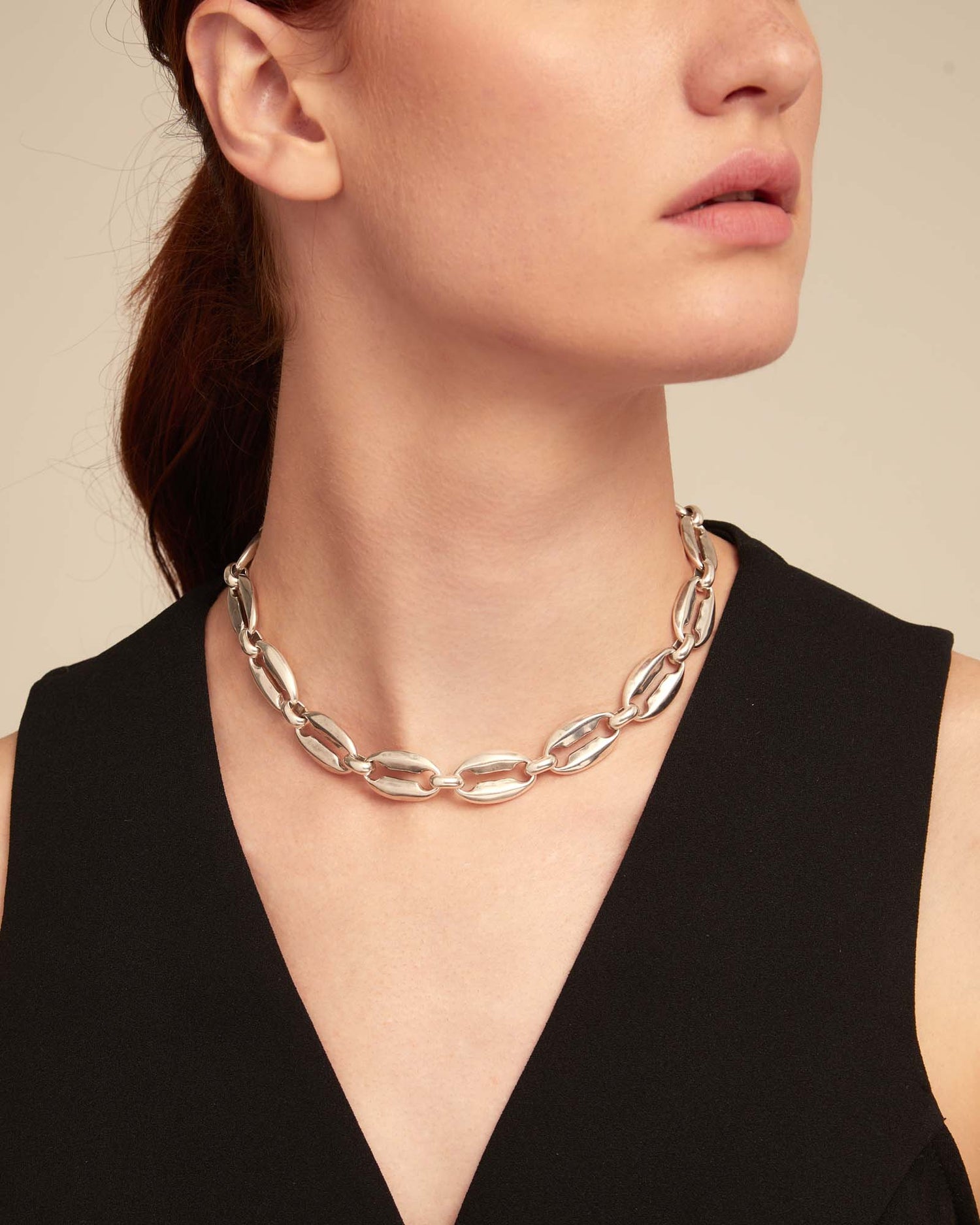 Handcrafted in sterling silver-plated metal, short length 41–46 cm.