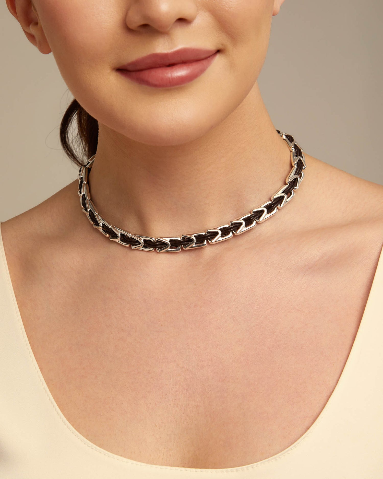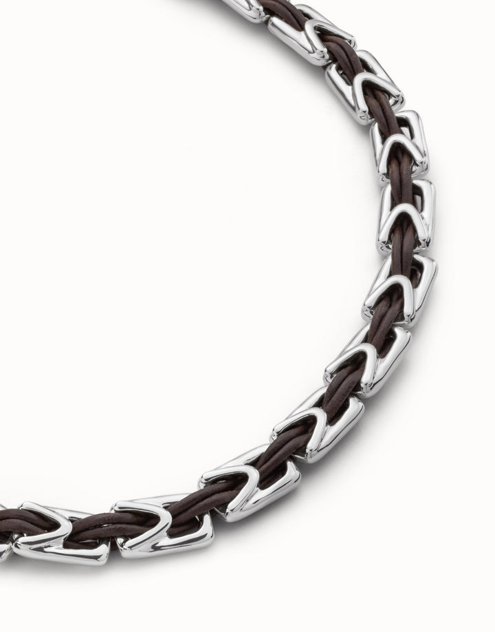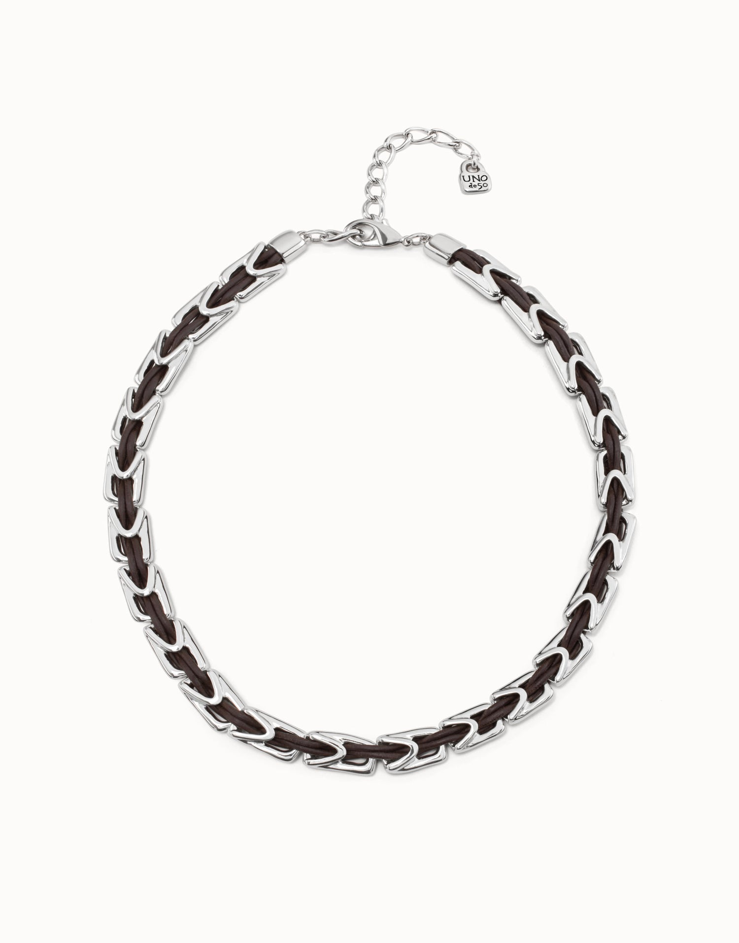 This Short leather necklace with links by UNOde50 combines silver-colored metal alloy links with rich leather, creating a contemporary, edgy design. Handmade in Spain, the carabiner clasp and extension chain allow adjustable fit. Perfect for layering or solo wear, it embodies the Brave collection’s courage and adventurous spirit while highlighting artisanal craftsmanship, individuality, and modern elegance.
