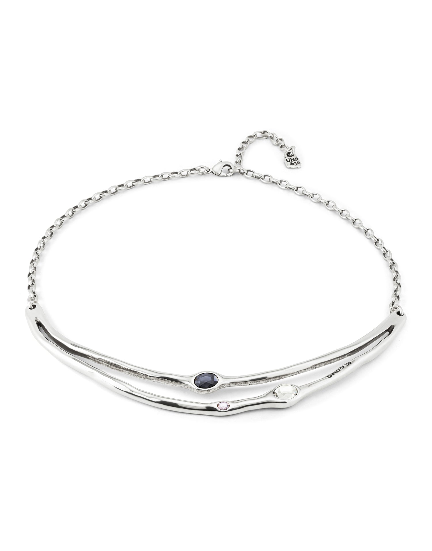 This Choker necklace with crystals by UNOde50 features rigid sterling silver-plated construction with gray, white, and pink faceted crystals. Handmade in Spain, it belongs to the Vital collection, representing energy, merit, and individuality. The asymmetrical crystal placement enhances sparkle and visual interest, creating a bold statement piece. Perfect for layering or wearing alone, it combines artisanal craftsmanship with contemporary design, offering a versatile accessory for those seeking expressive, dynamic, and sophisticated jewelry.