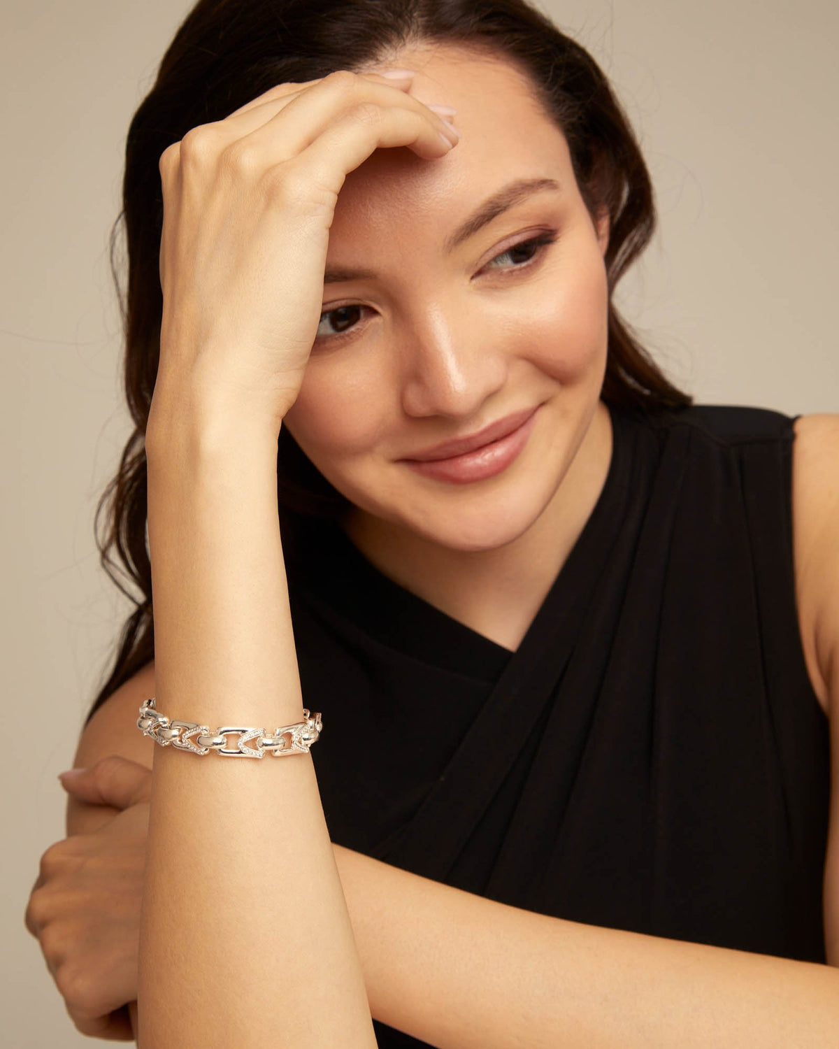 This Link chain bracelet with a topaz by UNOde50 combines sterling silver-plated small links with tiny topaz stones, creating a delicate yet striking design. Handmade in Spain, it belongs to the Brave collection, symbolizing courage and organic elegance. The adjustable carabiner clasp ensures versatile fit, making it suitable for layering or solo wear. Its artisanal craftsmanship highlights attention to detail, offering a modern, refined statement piece for those who value expressive, contemporary, and meaningful jewelry.