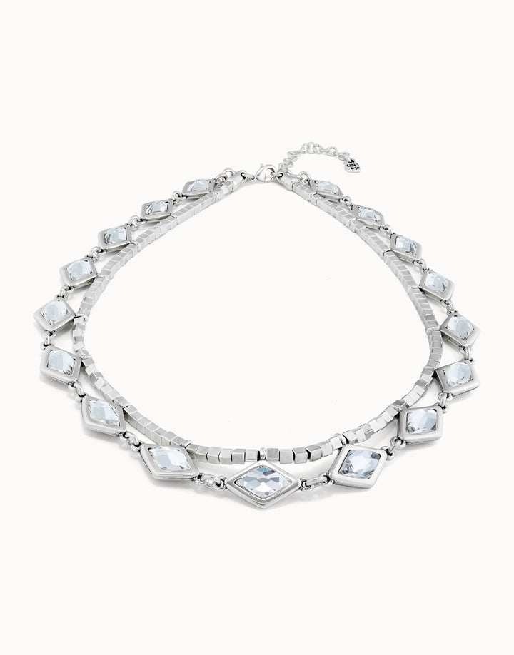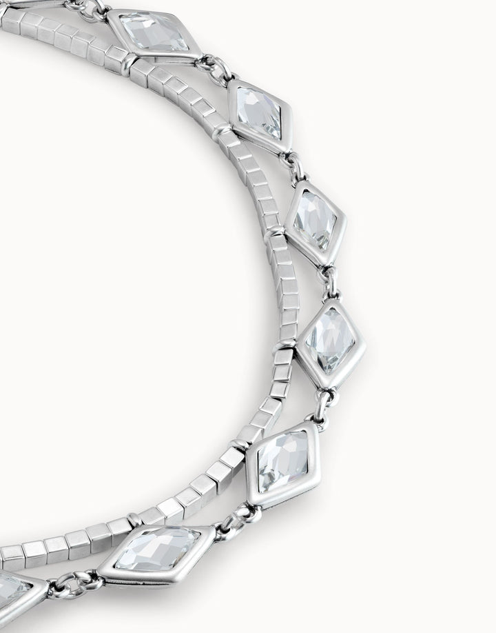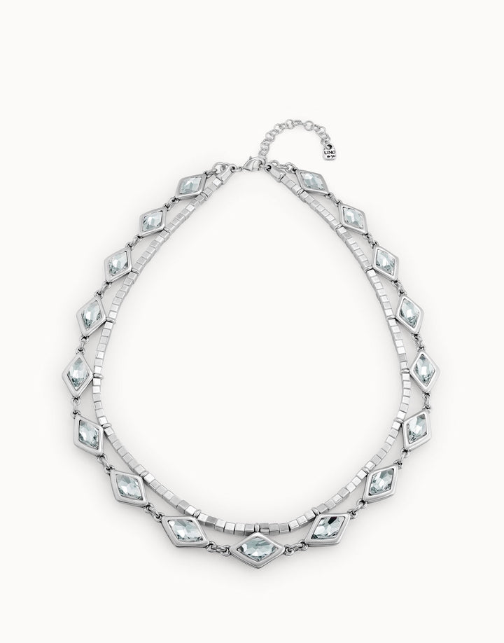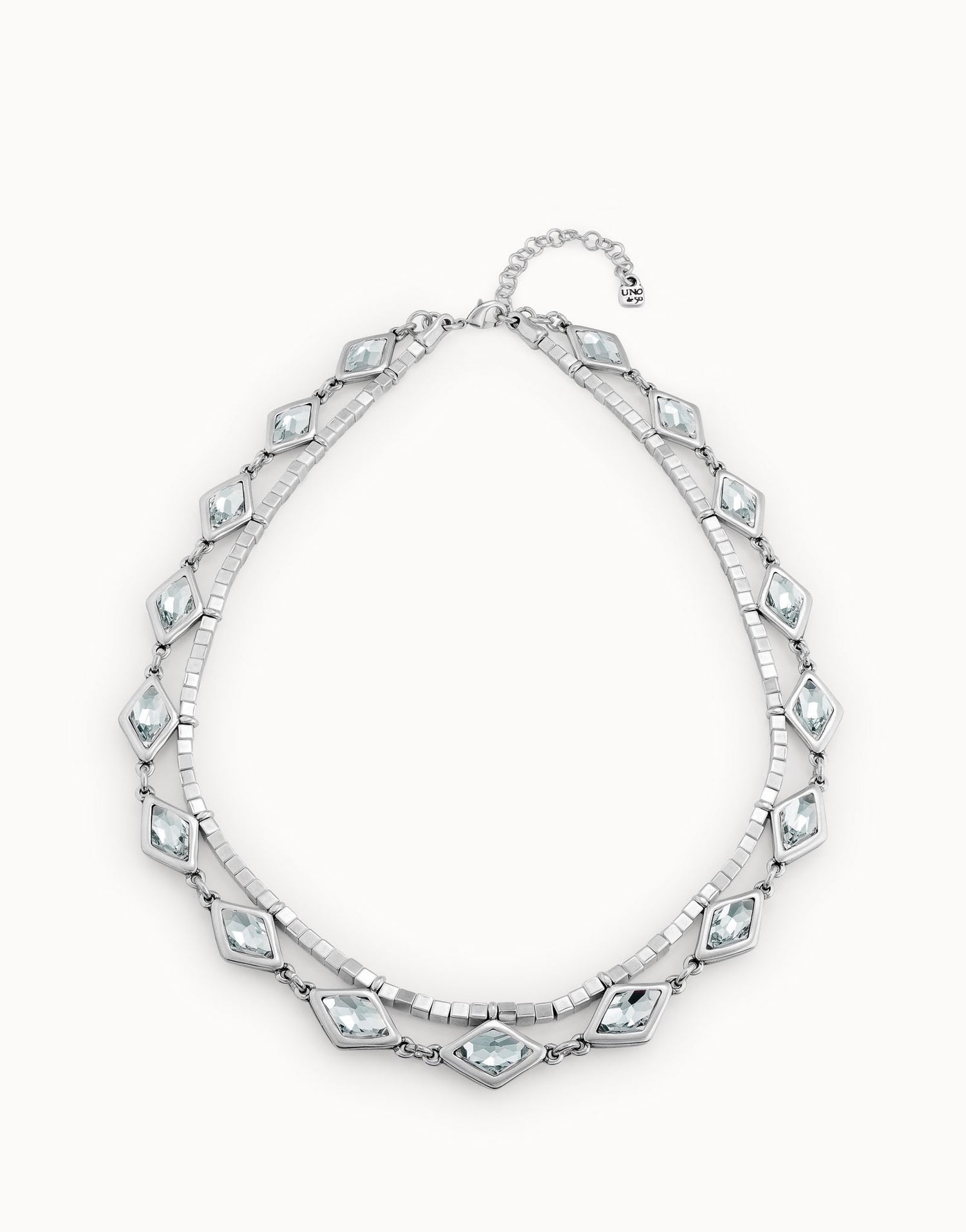 Sterling silver-plated metal with white faceted crystals, short length 43–48 cm, 1-strand on two levels, handcrafted in Spain.