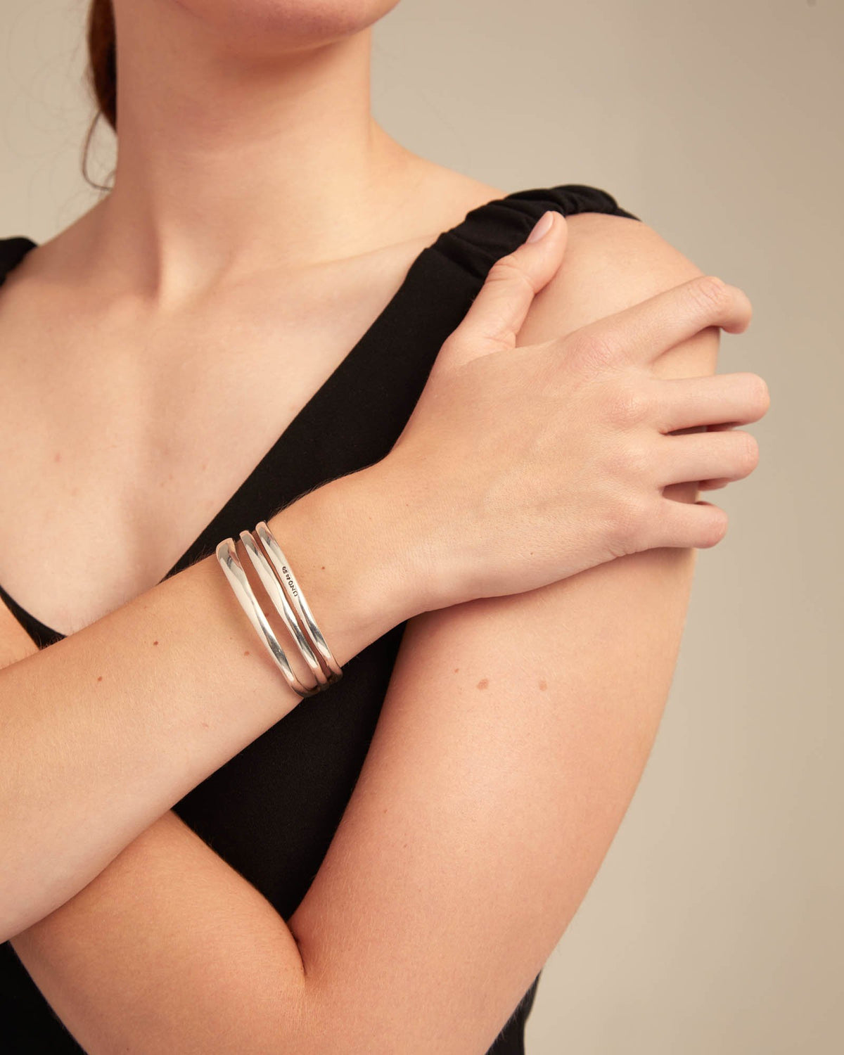 Sterling silver-plated rigid metal, triple cuff design, handcrafted in Spain.