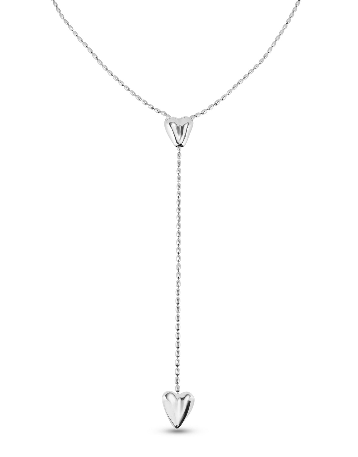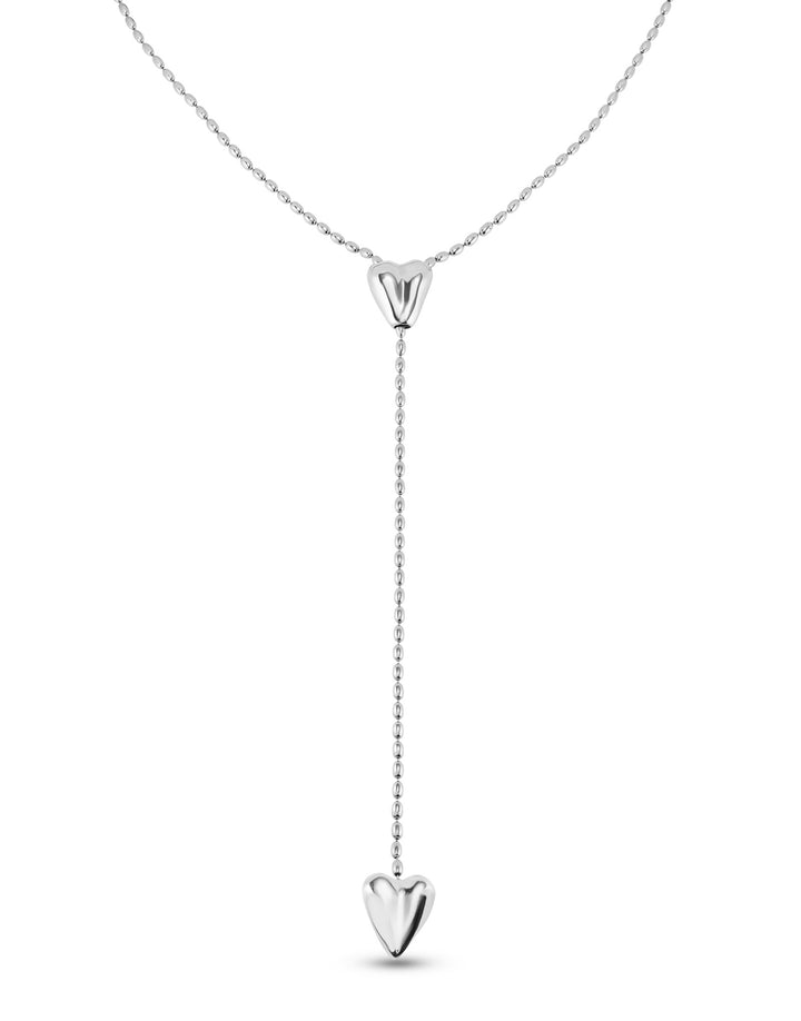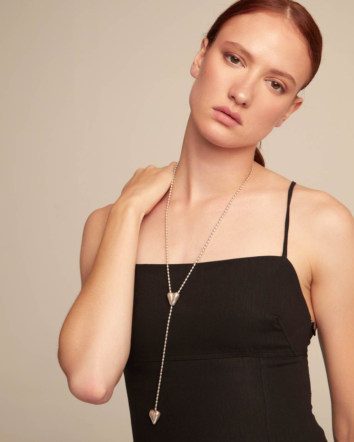 Sterling silver-plated metal, long chain with two hearts, adjustable center heart, maximum length 100 cm, minimum length 93 cm, handcrafted in Spain.