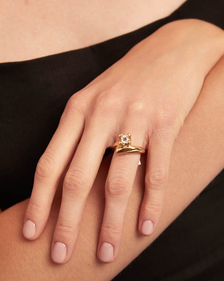 This Ring with White Cubic Zirconia by UNOde50 embodies spiritual elegance and luminous charm. Crafted in 18k gold-plated metal, the band showcases a radiant white cubic zirconia held by prominent claws, reflecting introspection and inner peace within the Spiritual collection. Perfect for stacking or wearing solo, the piece balances elegance, cosmic symbolism, and contemporary artistry. Each ring is handcrafted in Spain, ensuring uniqueness and meticulous attention to detail. This refined accessory represents personal empowerment, serenity, and spiritual connection, offering a versatile and meaningful addition to any jewelry collection, where craftsmanship and celestial inspiration converge.