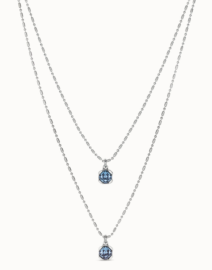 Sterling silver-plated metal, two-chain design with blue faceted crystals, adjustable carabiner clasp, maximum perimeter with extender 40 cm, handcrafted in Spain.
