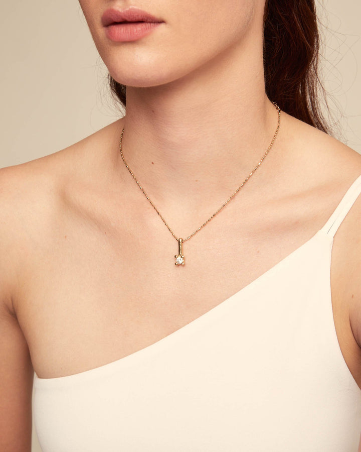 This Short Chain Necklace with White Cubic Zirconia by UNOde50 exudes spiritual elegance and refined design. The 18k gold-plated metal alloy features a central white cubic zirconia held by prominent claws, symbolizing introspection, serenity, and cosmic connection within the Spiritual collection. Its short length allows for layering or solo wear, creating a luminous focal point. Handcrafted in Spain, the necklace merges timeless craftsmanship with celestial inspiration, embodying the freedom, peace, and elegance of UNOde50’s artisan jewelry. A subtle yet striking piece, it celebrates the wearer’s spiritual connection and personal expression.