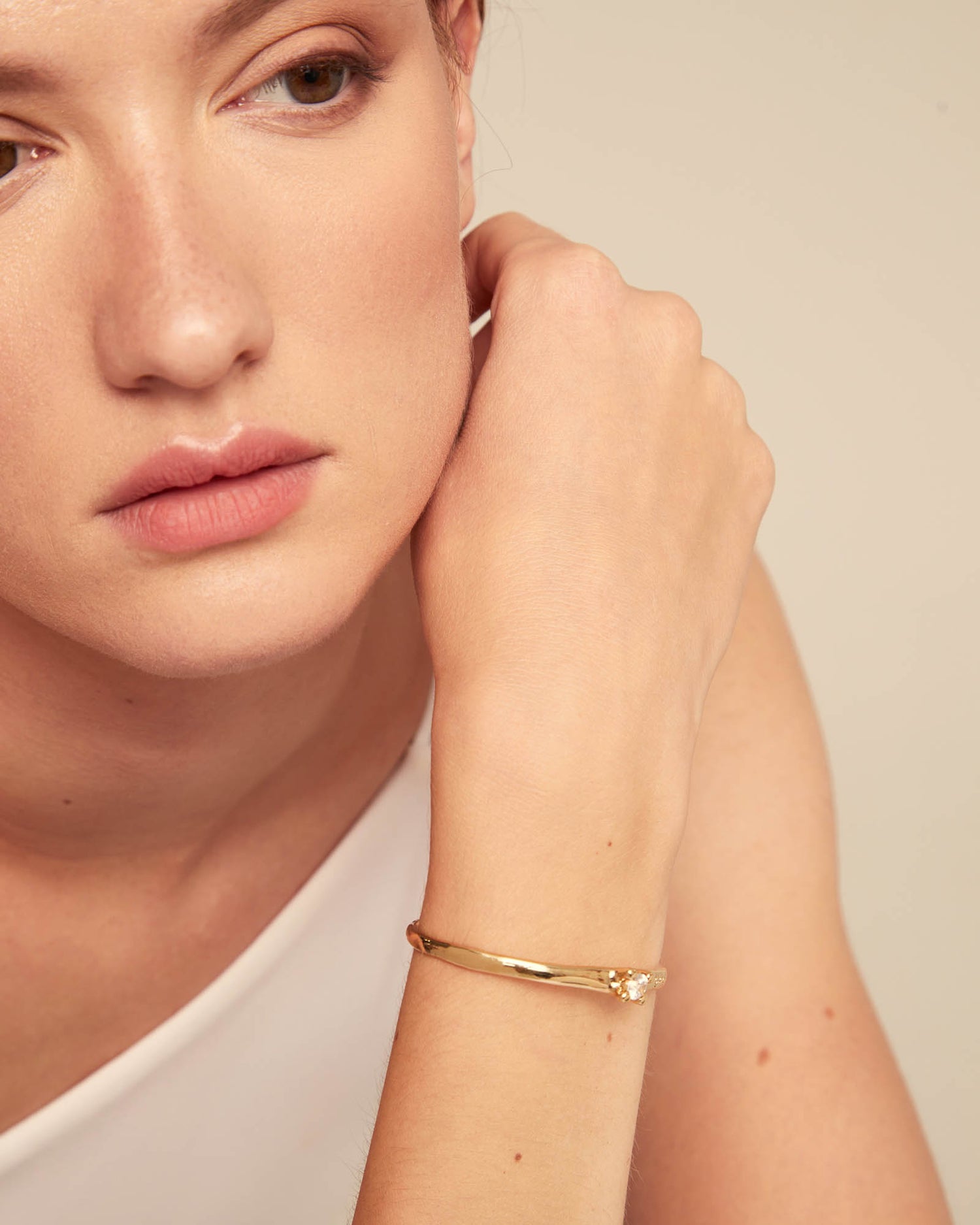 This Cuff Bracelet with Blue Cubic Zirconia by UNOde50 is a rigid sterling silver-plated design showcasing a central luminous blue crystal. Part of the Spiritual collection, it embodies introspection, serenity, and cosmic inspiration. Handcrafted in Spain, the prominent claws emphasize the crystal’s brilliance, creating a bold yet refined accessory. Ideal for solo wear or layering, the bracelet conveys spiritual awareness, elegance, and meticulous craftsmanship. Its luminous centerpiece and structured design reflect UNOde50’s commitment to high-quality handmade jewelry with symbolic and contemporary appeal.