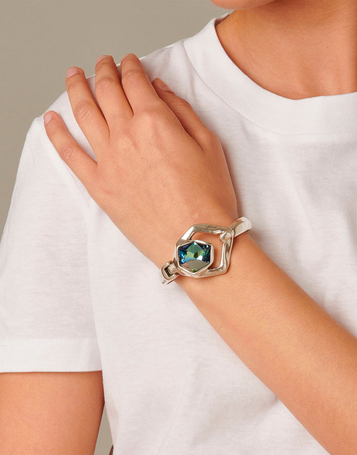 This Fresh Bracelet by UNOde50 is a sterling silver-plated metal piece designed to highlight natural beauty and understated elegance. Part of the collection inspired by organic forms, it captures subtle movement and modern sophistication. Handcrafted in Spain, it embodies artisanal precision, contemporary design, and wearable versatility, offering a refined accessory suitable for layering or solo styling.