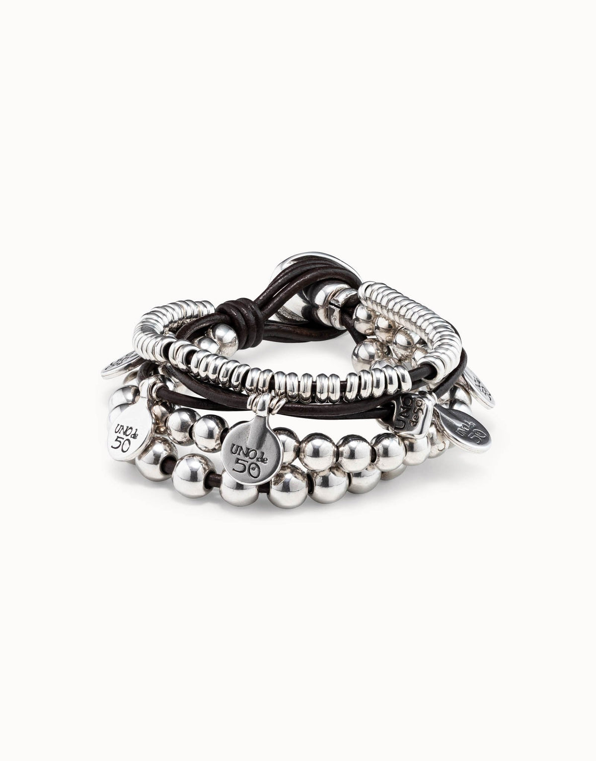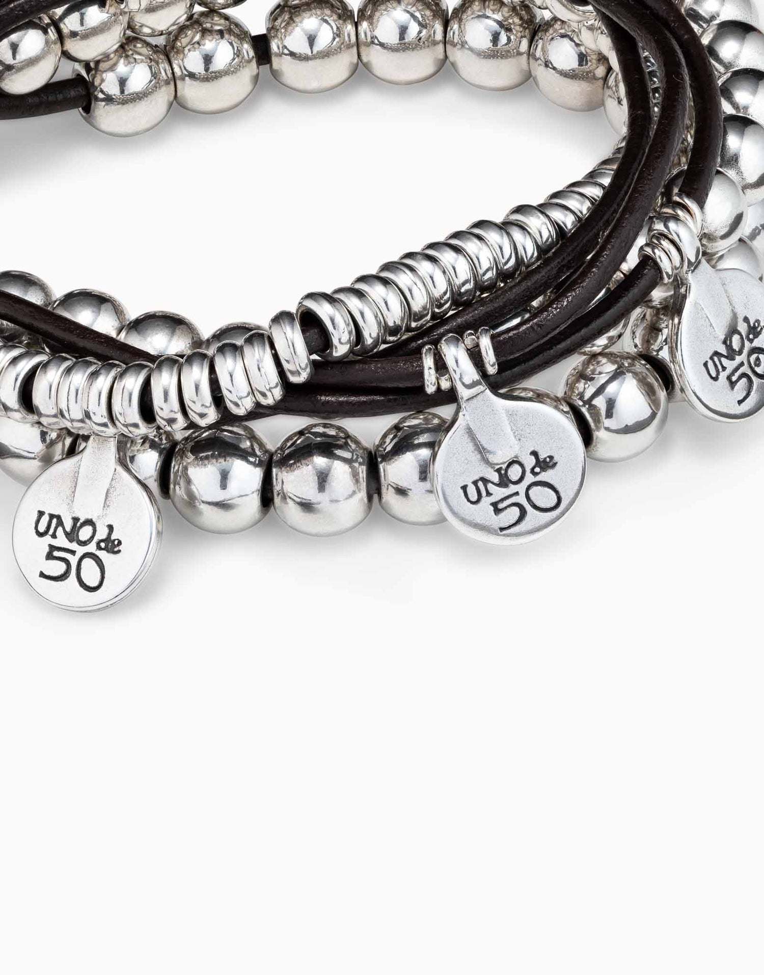 This Leather Beaded Bracelet with Charms by UNOde50 combines artisanal sophistication with contemporary flair. Crafted in Spain using sterling silver-plated metal and rows of leather adorned with white synthetic pearls and the brand’s signature logo, it conveys elegance and playful individuality. Medium-length design allows for versatile styling—layered with other bracelets or worn solo as a chic accent. Representing creativity, charm, and a love for handcrafted jewelry, it is ideal for free-spirited individuals seeking a meaningful yet fashionable piece that merges traditional craftsmanship with modern aesthetics.