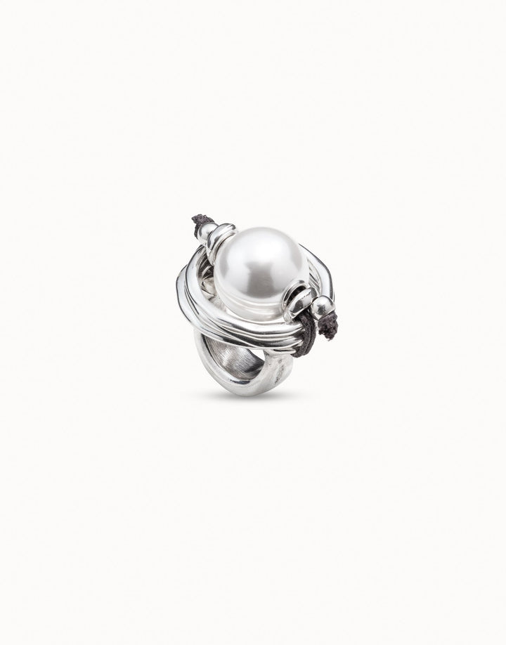 This Pearl Ring by UNOde50 merges classic elegance with contemporary design. Featuring a large central shell pearl paired with brown leather, the sterling silver-plated metal ring is entirely handmade in Spain. Its harmonious contrast of textures symbolizes balance and sophistication, reflecting a refined yet playful aesthetic. Perfect for layering or as a statement piece, it embodies individuality, luxury, and artisanal craftsmanship, appealing to wearers who value the fusion of natural elements with modern jewelry design.