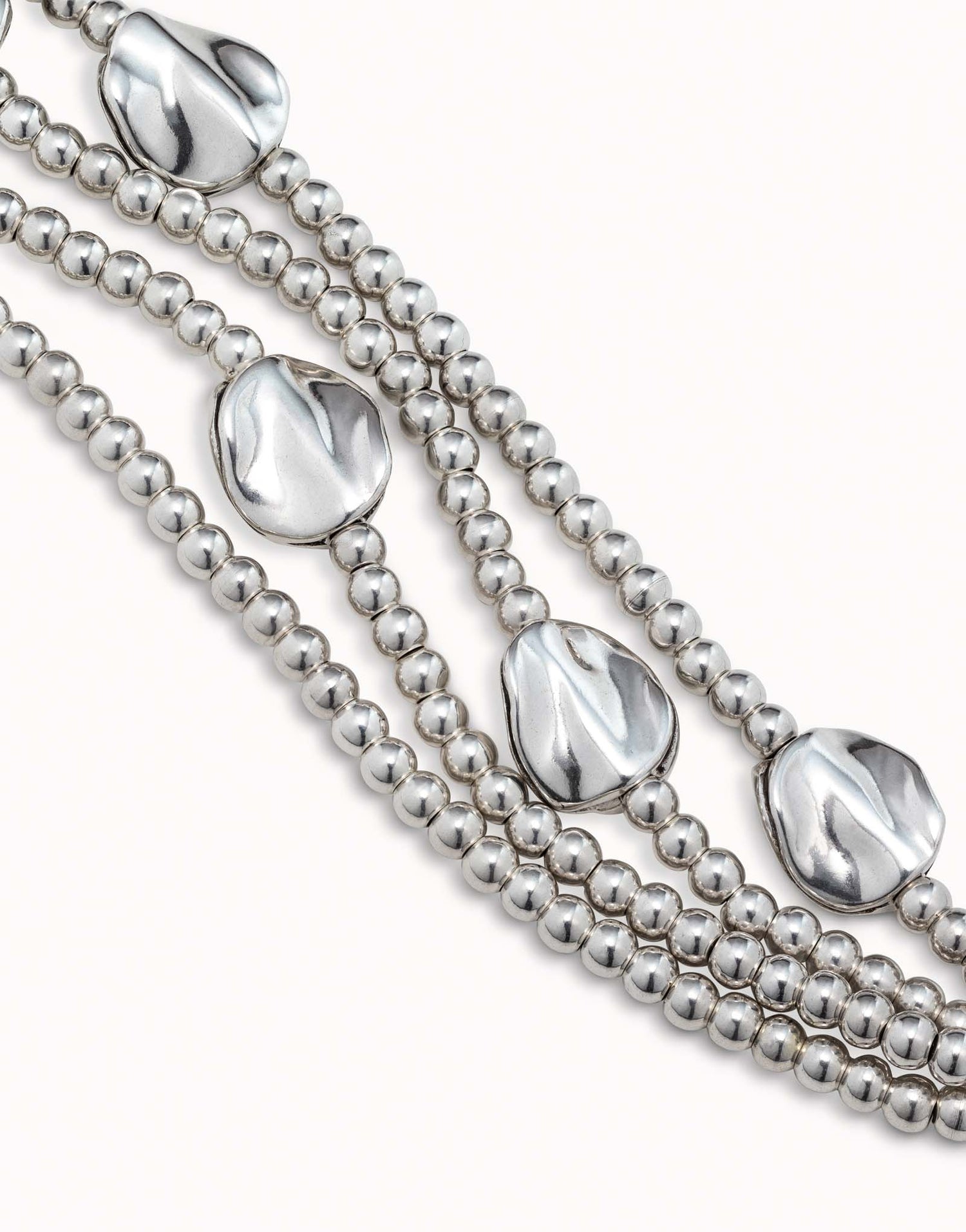 Sterling silver-plated metal with multi-strand leather and beads, medium length, minimum perimeter 17 cm, maximum perimeter with extender 19.3 cm.