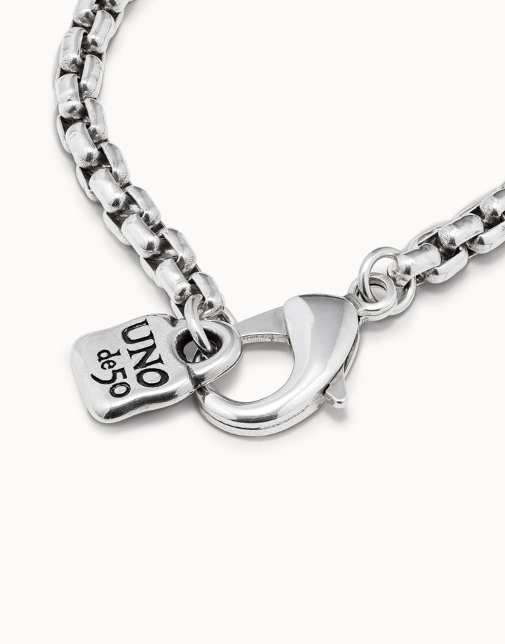 This Cuban Link Chain Bracelet by UNOde50 is a bold expression of urban sophistication. Sterling silver-plated and handcrafted in Spain, it features a carabiner clasp and the brand’s iconic padlock pendant, symbolizing strength, style, and modern elegance. Designed for the contemporary woman who embraces the city’s energy, this bracelet balances edgy appeal with artisanal quality. Its elongated design provides a comfortable fit, making it perfect for layering or standalone wear. A versatile, high-impact piece that merges fashion-forward design with symbolic detail, reflecting UNOde50’s dedication to craftsmanship and urban style.