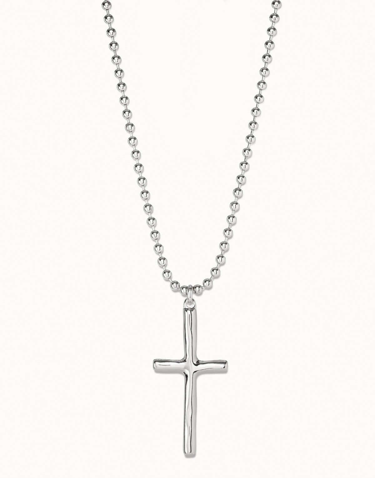 Sterling silver-plated metal with cross-shaped pendant, long length, adjustable clasp, bead size 6.5 cm, minimum length 73.5 cm.