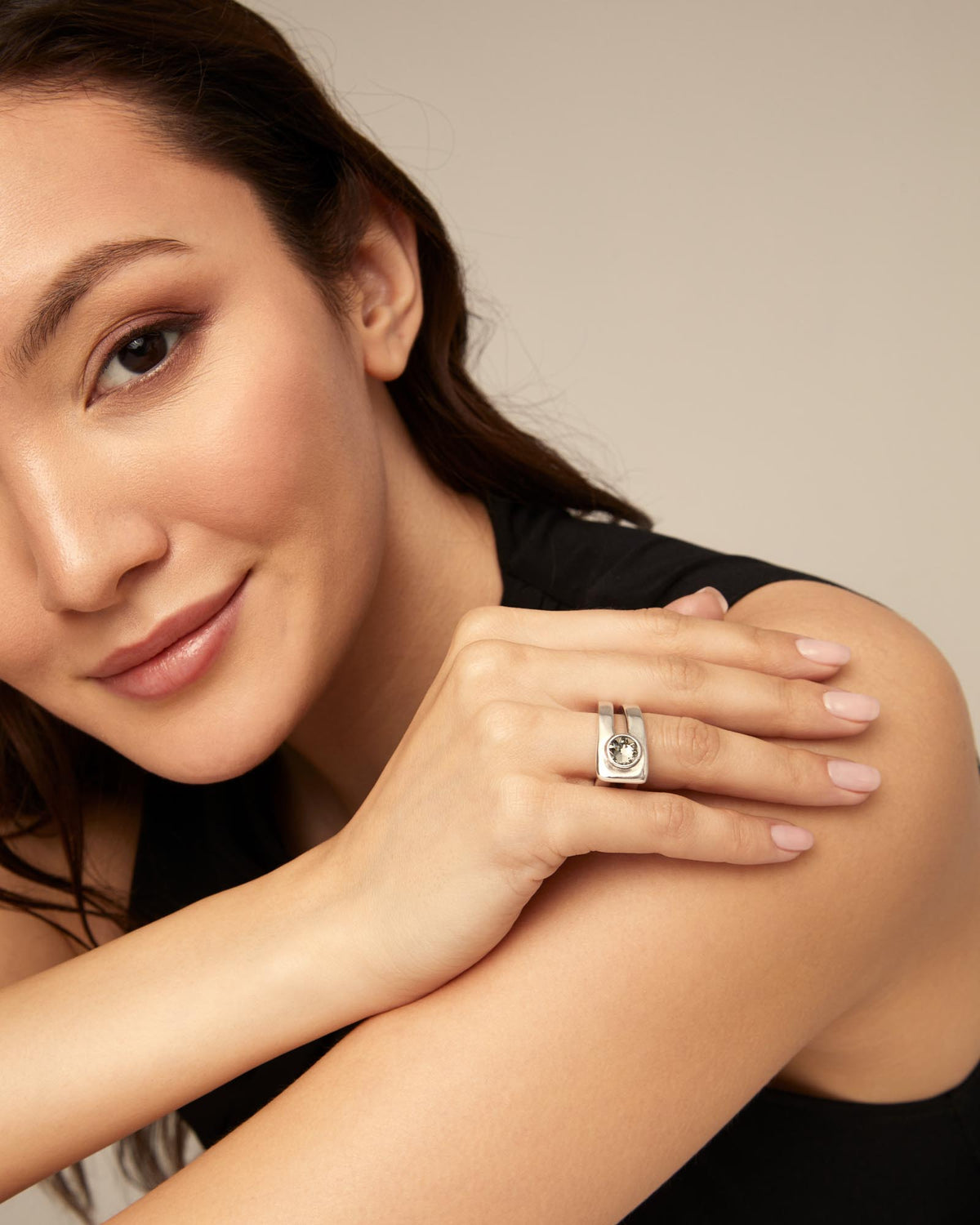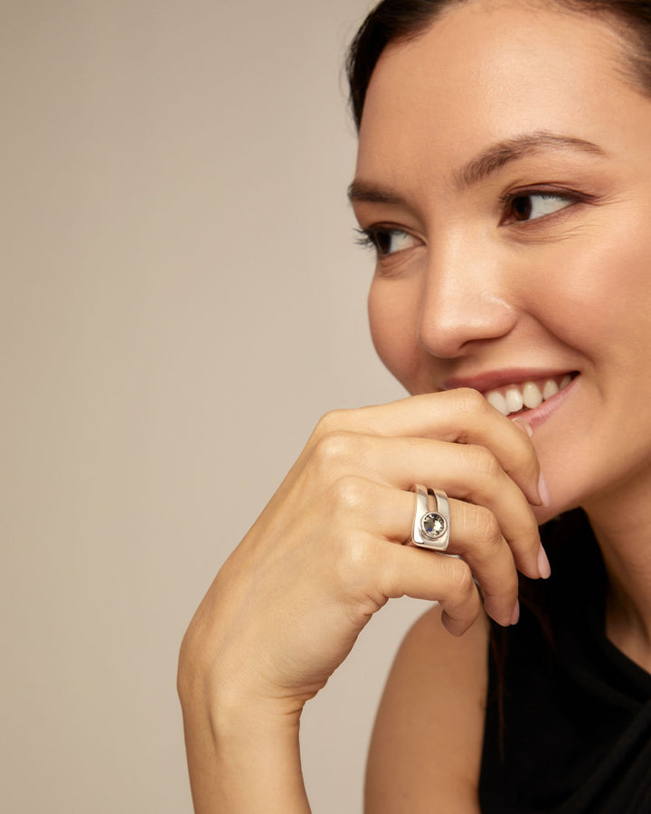 This Ring with Rectangular Link by UNOde50 combines strength, individuality, and contemporary design. Handcrafted in Spain from sterling silver-plated metal, the ring features a rectangular link housing a faceted gray crystal, representing empowerment and self-belief. Part of the Independent collection, it symbolizes confidence, resilience, and personal pride through everyday objects transformed into meaningful jewelry. Its polished finish and geometric silhouette make it ideal for stacking or solo wear, merging artisanal craftsmanship with expressive modern aesthetics, offering a refined, versatile accessory that embodies empowerment and bold sophistication.