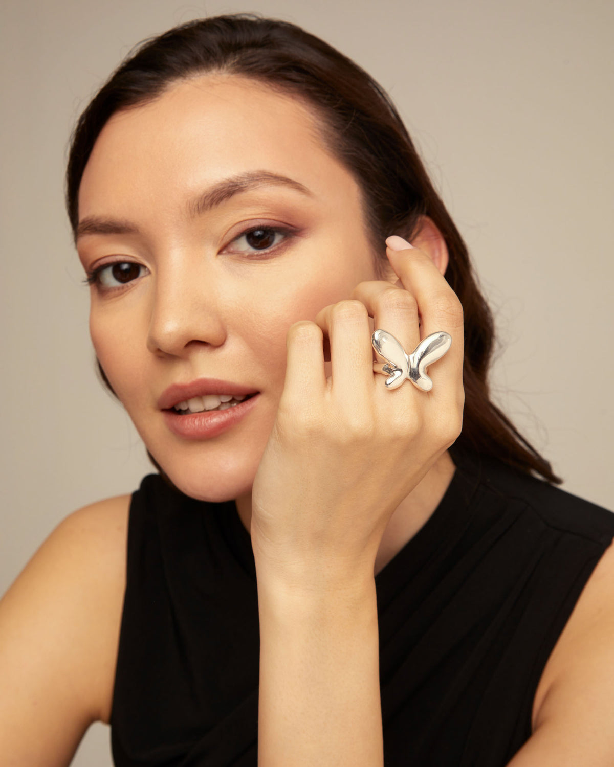This Ring with Medium Butterfly Shape by UNOde50 exudes playful elegance and artisanal mastery. Handcrafted in Spain from sterling silver-plated metal, the central mid-sized butterfly symbolizes transformation, freedom, and natural beauty. Part of the Free collection, the ring can be stacked or worn solo, combining contemporary style with intricate craftsmanship. Its polished finish enhances the delicate contours of the butterfly, creating a versatile, expressive accessory that celebrates individuality, whimsical design, and refined wearable elegance.