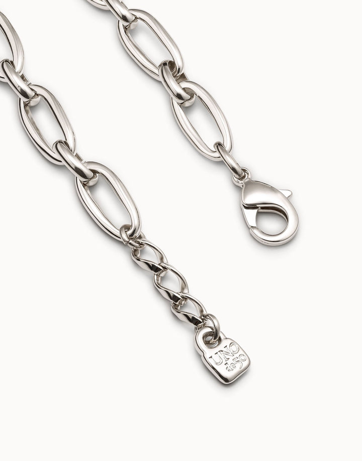 Sterling silver-plated metal, mid-sized oval links, carabiner clasp, long length, minimum perimeter 18.5 cm, maximum perimeter 20 cm, maximum perimeter with extender 23 cm.