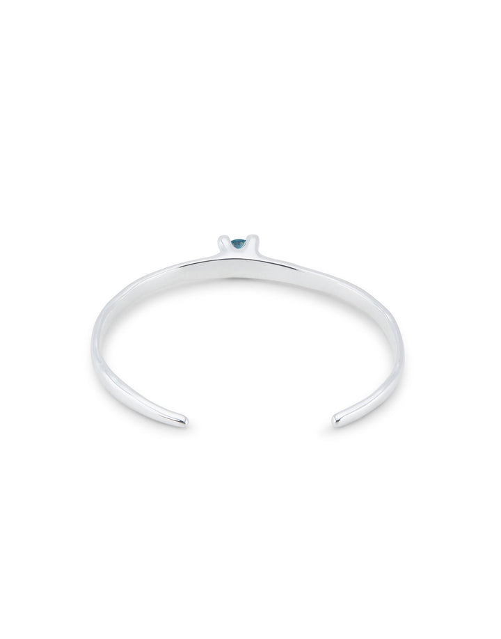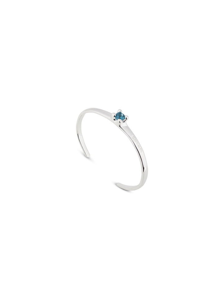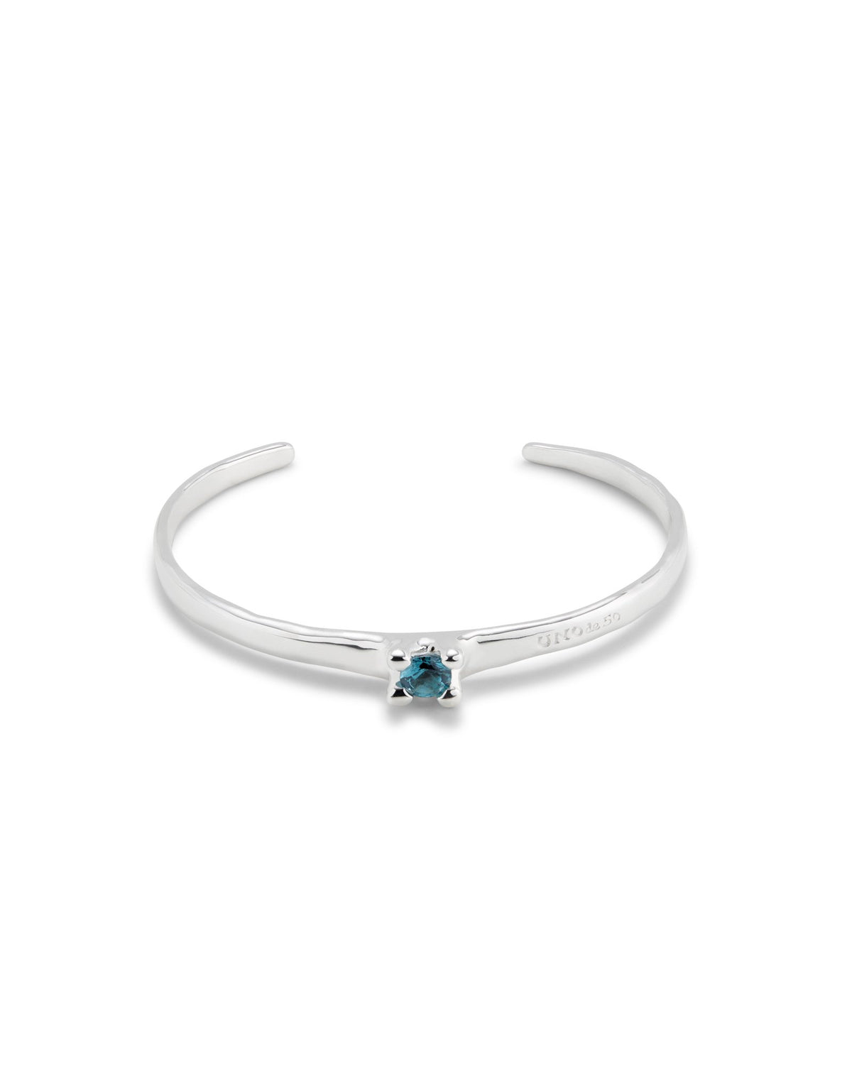 Sterling silver-plated metal with blue cubic zirconia, rigid cuff, maximum perimeter 17 cm, minimum perimeter 15 cm.