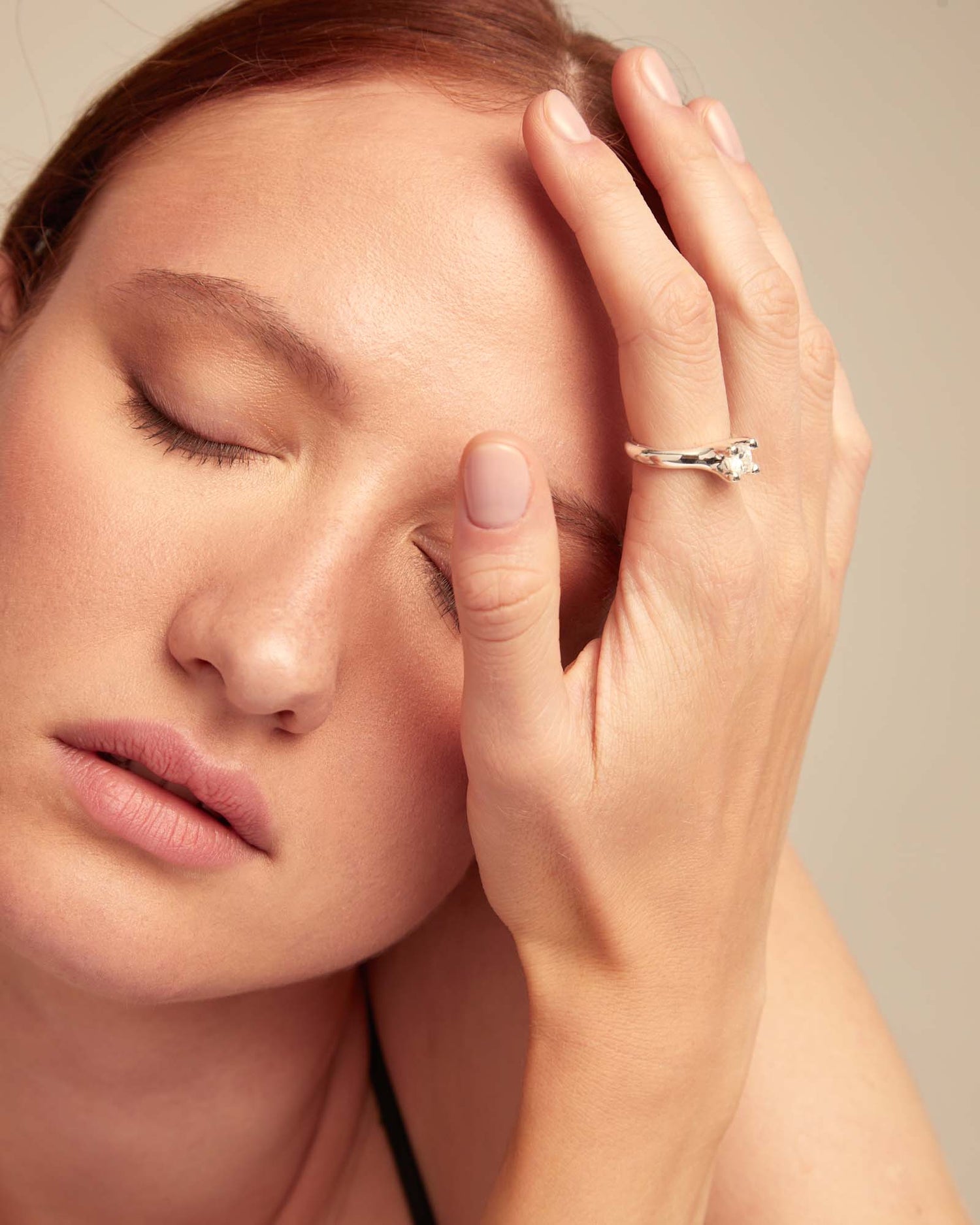 Sterling silver-plated metal with white cubic zirconia solitaire, diameter 16.4 mm, minimum perimeter 58 mm.