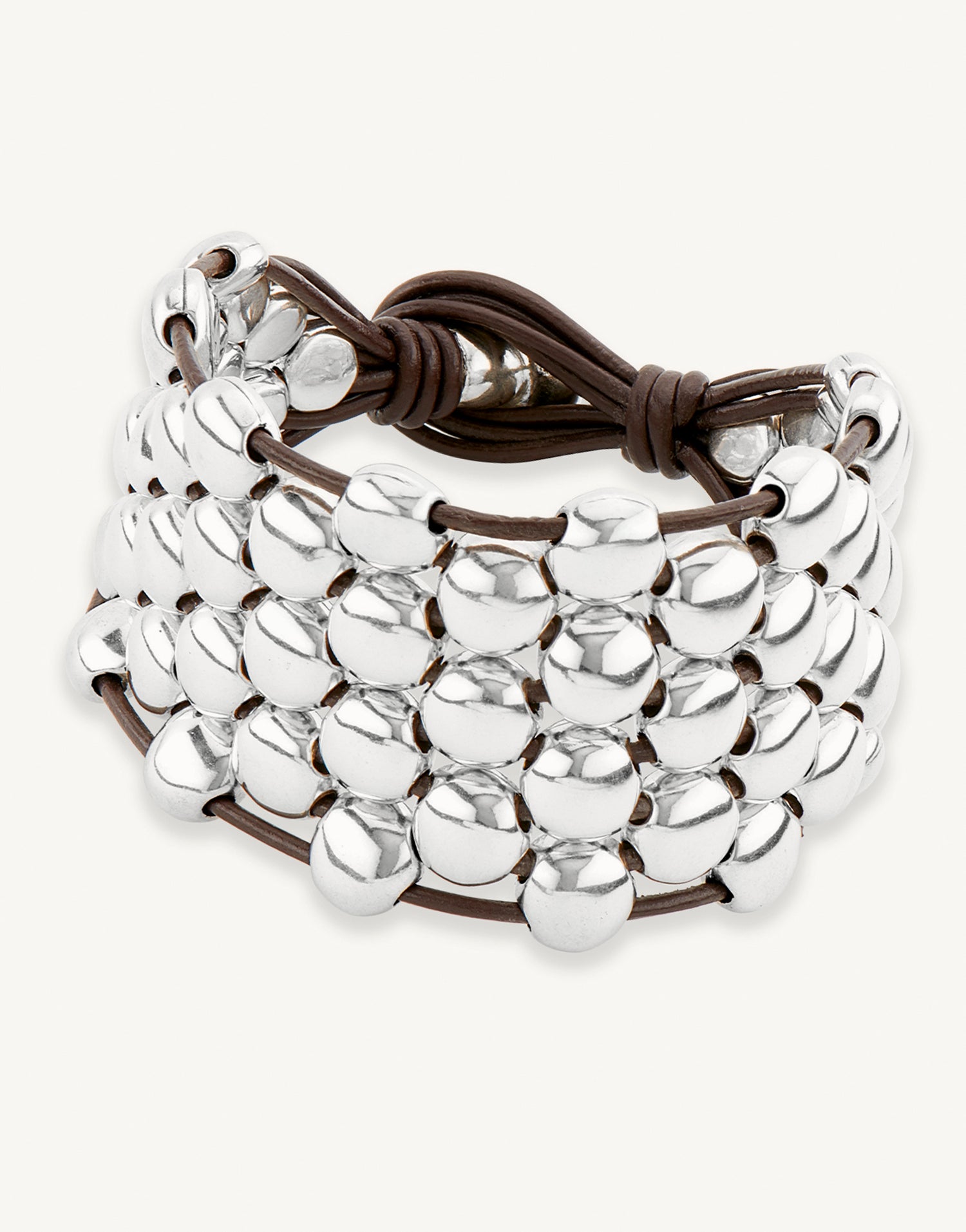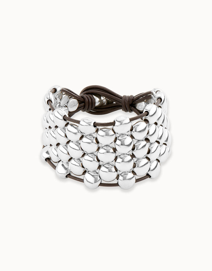 Leather and silver-clad metal, adjustable length, maximum length 17.5 cm, minimum length 15.5 cm, maximum perimeter with extender 17.5 cm, minimum perimeter 15.3 cm, plated in sterling silver.