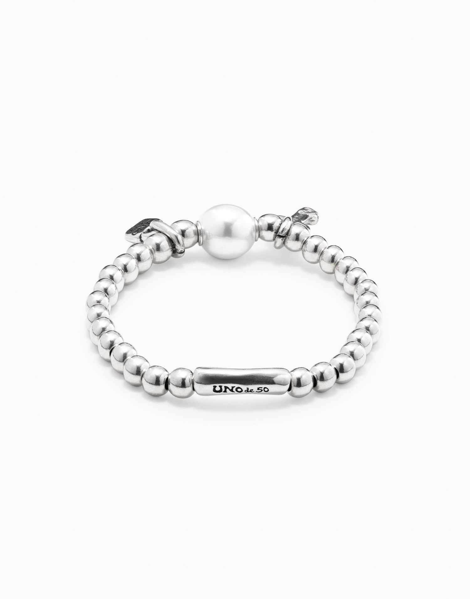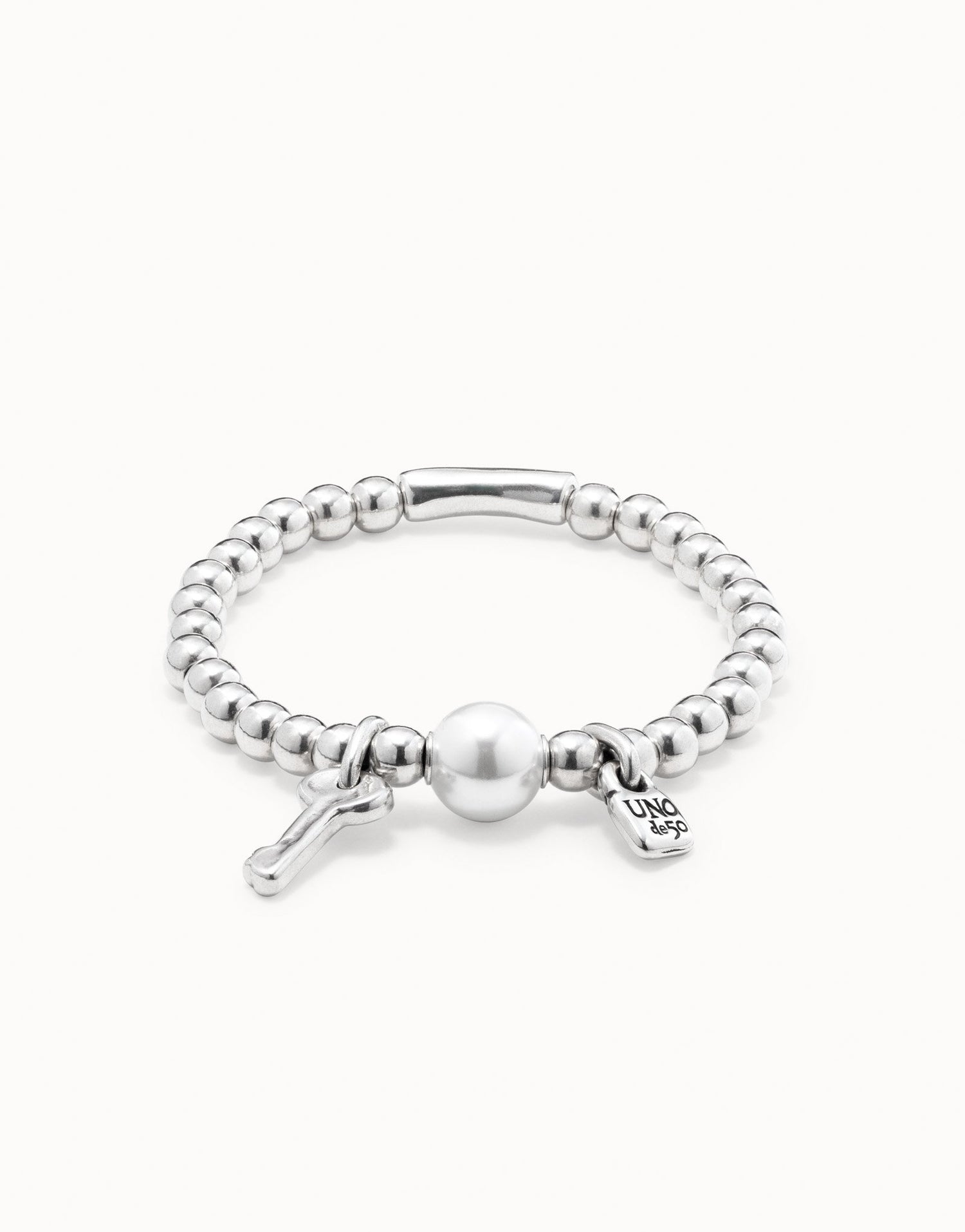 This Beaded Stretch Bracelet with a Pearl by UNOde50 is a sophisticated, contemporary accessory. Handcrafted in Spain from 15-micron silver-plated elastic rubber, it features a central large shell pearl and a key charm, symbolizing independence and conceptual artistry. Its versatile design allows for stacking or solo wear, merging polished craftsmanship with meaningful symbolism. Part of UNOde50’s distinctive style, it embodies personality, elegance, and hand-finished quality, offering a refined bracelet that enhances everyday and special occasion ensembles with timeless, wearable artistry.