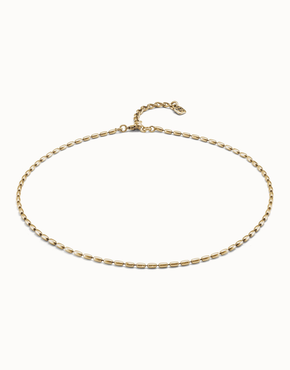 18K gold-plated metal, short oval link chain, adjustable carabiner clasp, maximum length 44.5 cm, minimum length 40 cm.