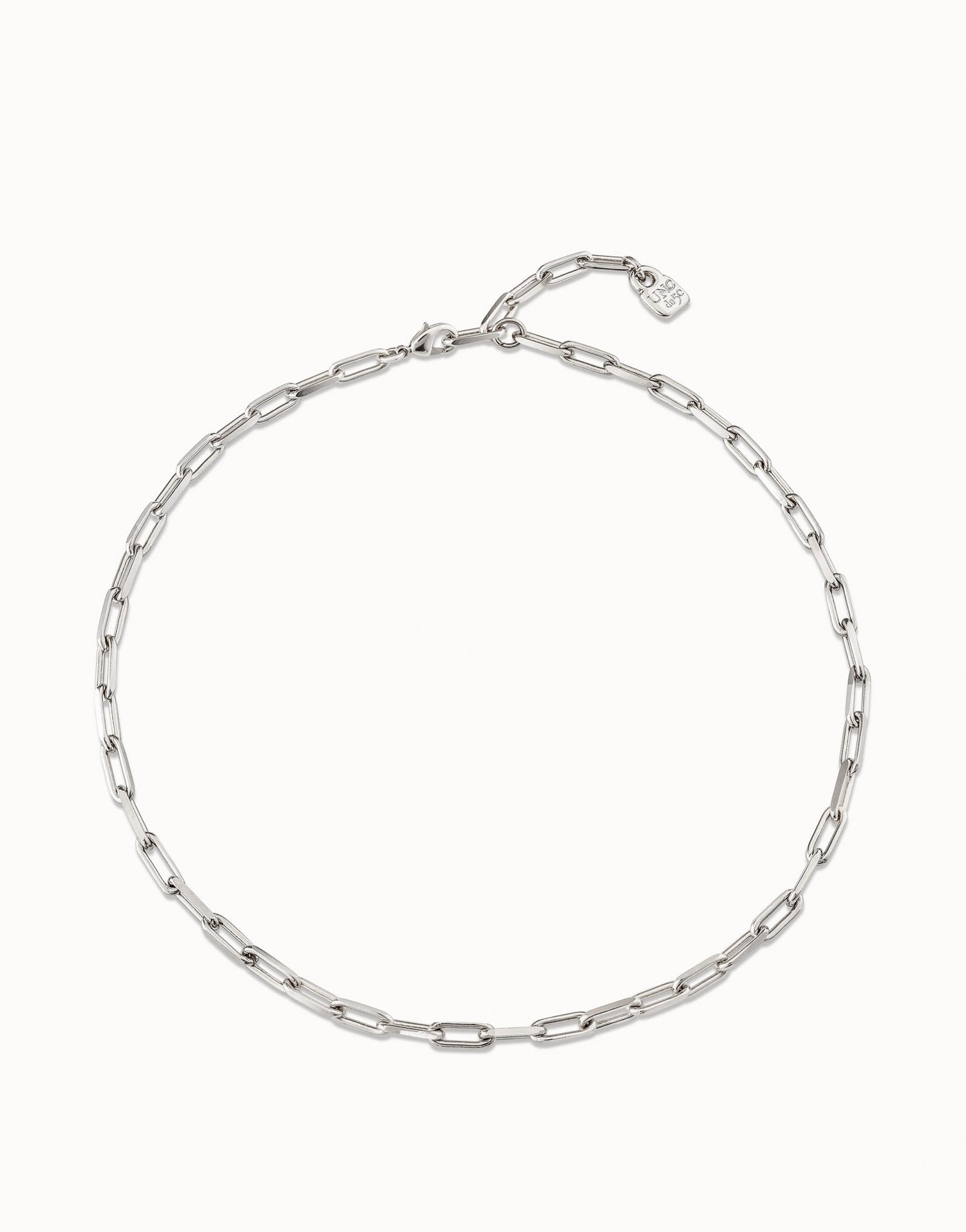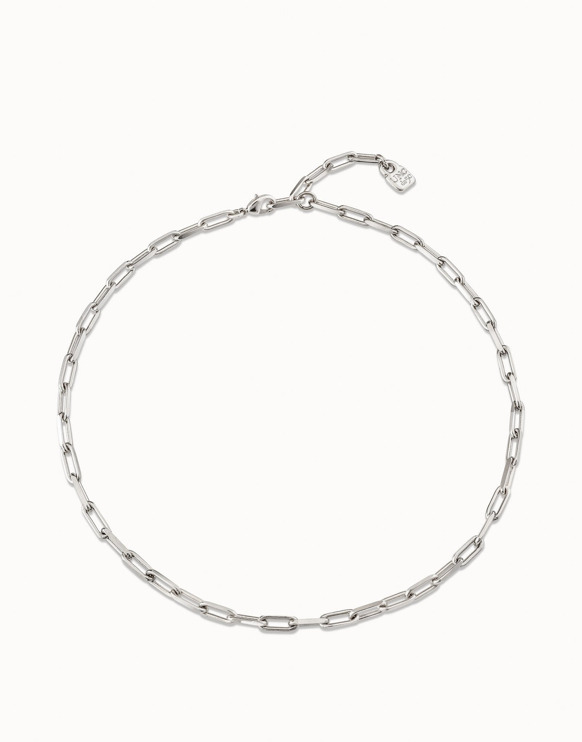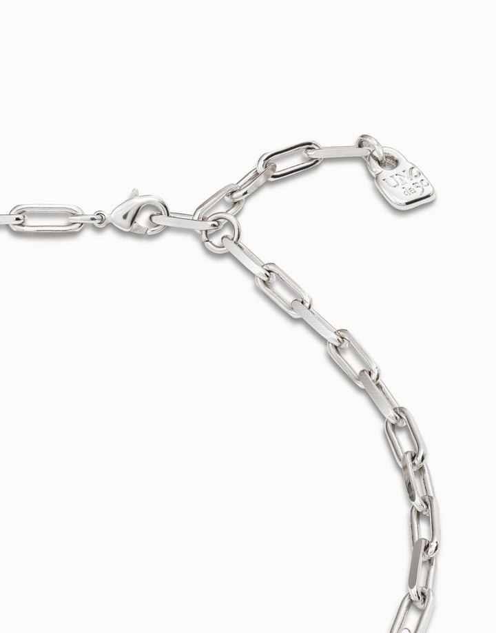 This Short Link Chain Charm Necklace by UNOde50 features a sleek, unisex design with narrow elongated sterling silver-plated links, embodying contemporary elegance and versatility. Handmade in Spain, it can be worn alone or combined with charms from the Personalización collection, allowing for personalized styling. Ideal for daily wear or special occasions, the necklace reflects UNOde50’s signature artisanal craftsmanship and attention to detail. Its refined structure and subtle shine create a sophisticated statement, offering both timeless appeal and modern edge, perfect for layering with other necklaces or wearing as a standout piece.