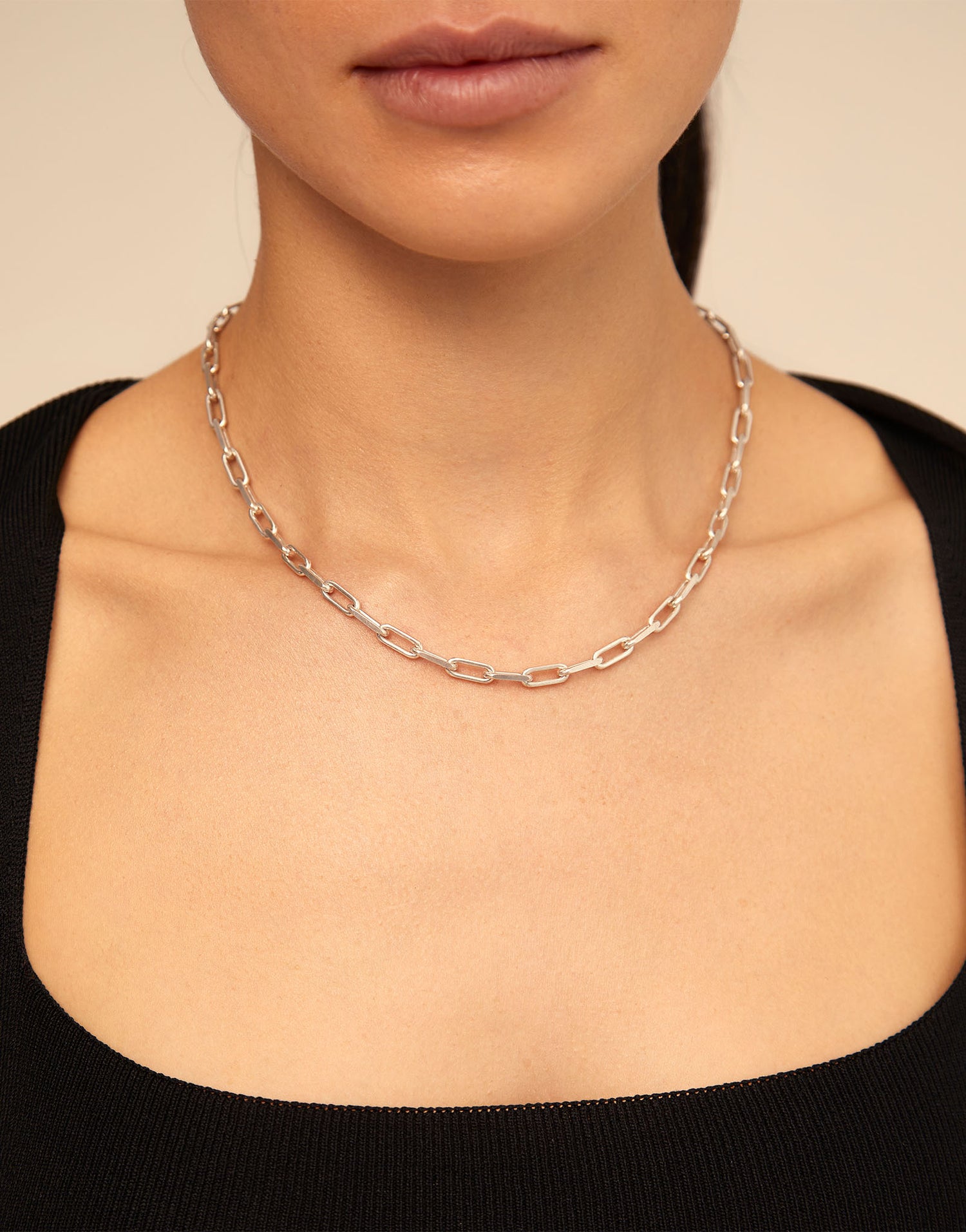 Handcrafted in sterling silver-plated metal with narrow elongated links. Short length type. Maximum length: 45 cm, minimum length: 41 cm. 100% handmade in Spain.