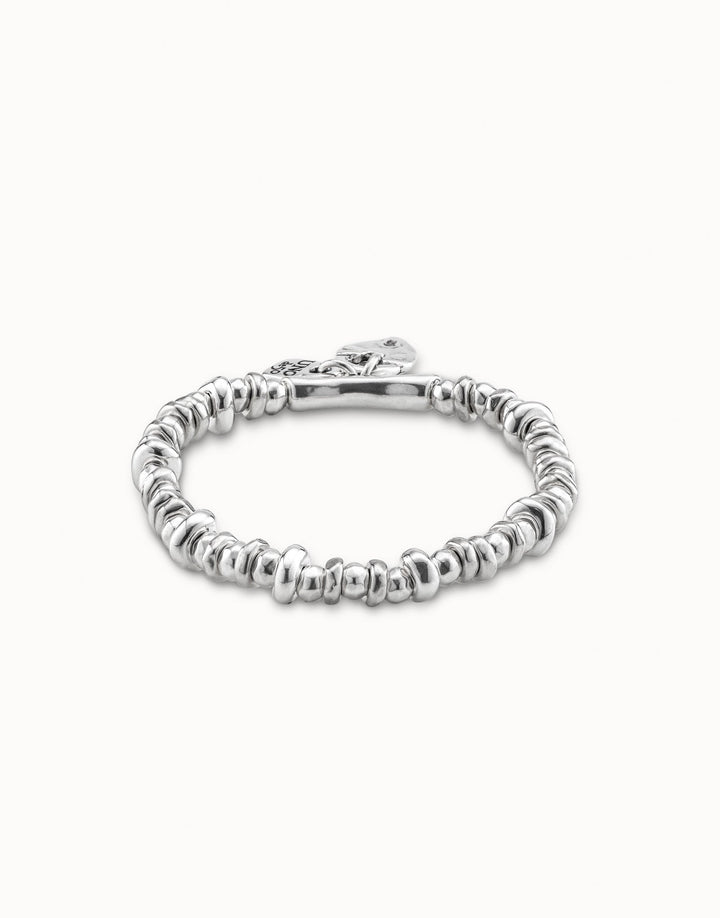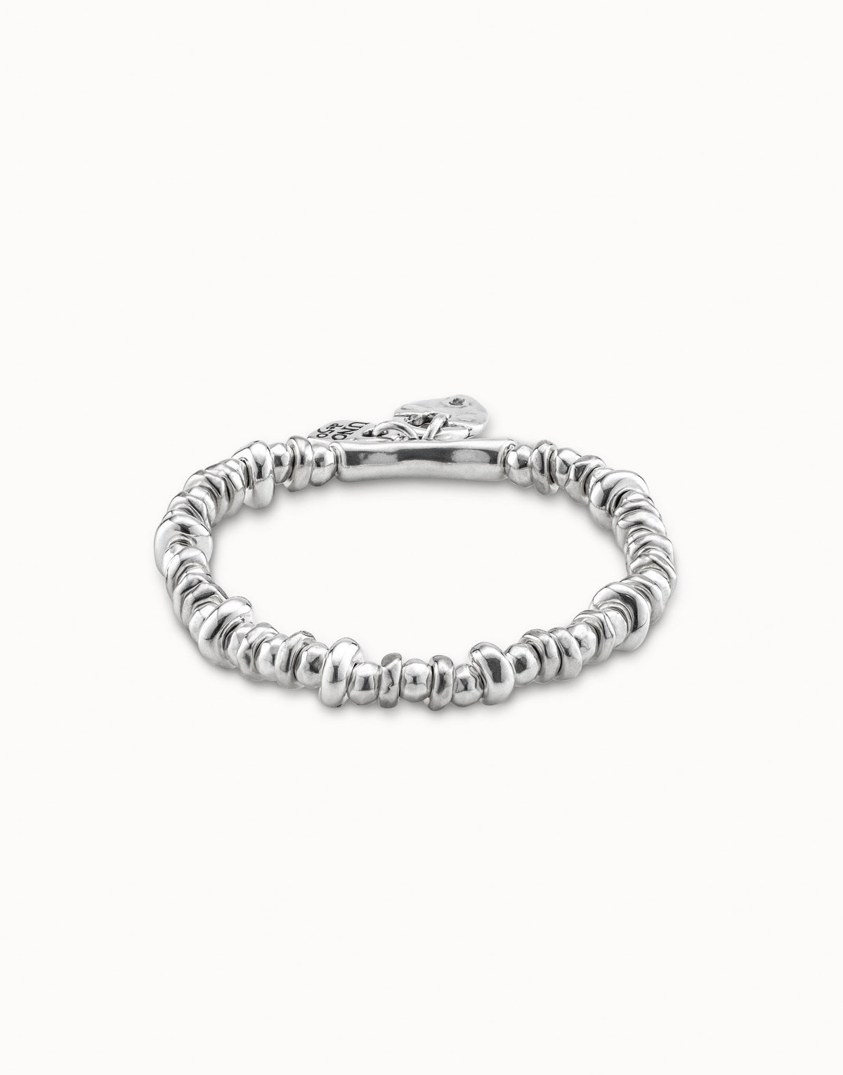 This Beaded Stretch Bracelet with Charms by UNOde50 features an elastic design composed of silver-plated pieces, highlighted by a tubular element from which hang the brand’s iconic padlock and a heart charm from the Valentine’s Day 2019 capsule collection. Handmade in Spain, the bracelet embodies playful sophistication and symbolic meaning, perfect for stacking or wearing solo. Its versatile design conveys elegance, personality, and UNOde50’s artisanal craftsmanship. Ideal as a gift or a personal statement piece, it reflects the brand’s unique approach to handcrafted jewelry and contemporary design while maintaining timeless appeal.