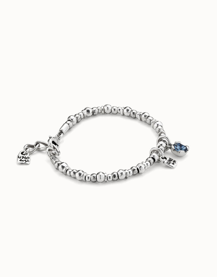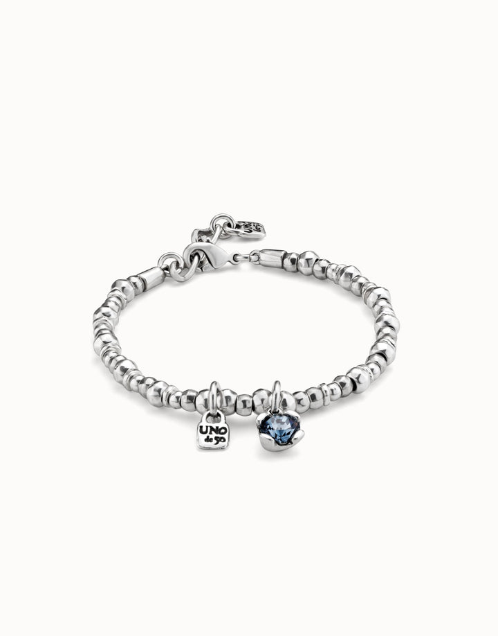 This Beaded Stretch Bracelet with Blue Crystal by UNOde50 from the Charismatic collection features sterling silver-plated beads, a blue faceted crystal, and the iconic UNOde50 padlock charm. Handmade in Spain, the bracelet conveys confidence, allure, and dynamic style. Its adjustable carabiner clasp ensures a perfect fit, making it versatile for layering or solo wear. The design embodies charisma and the ability to captivate, highlighting UNOde50’s artisanal craftsmanship and contemporary flair. Perfect for daily wear or special occasions, it balances elegance, high-quality materials, and symbolic design to create a unique, expressive statement accessory.