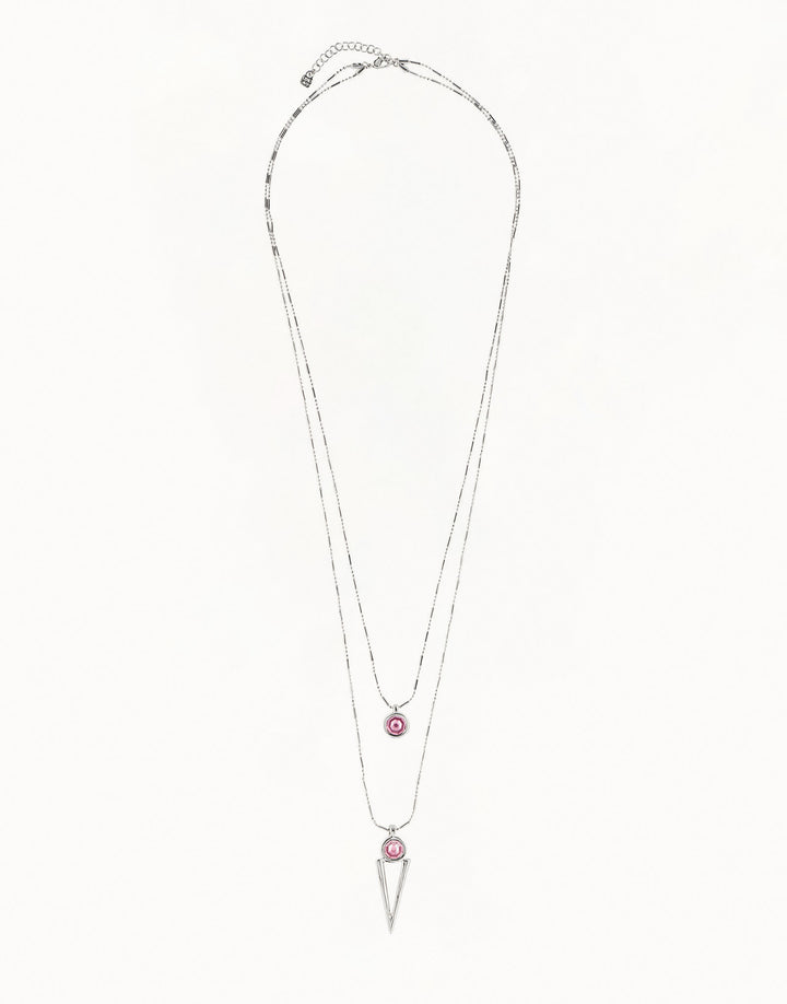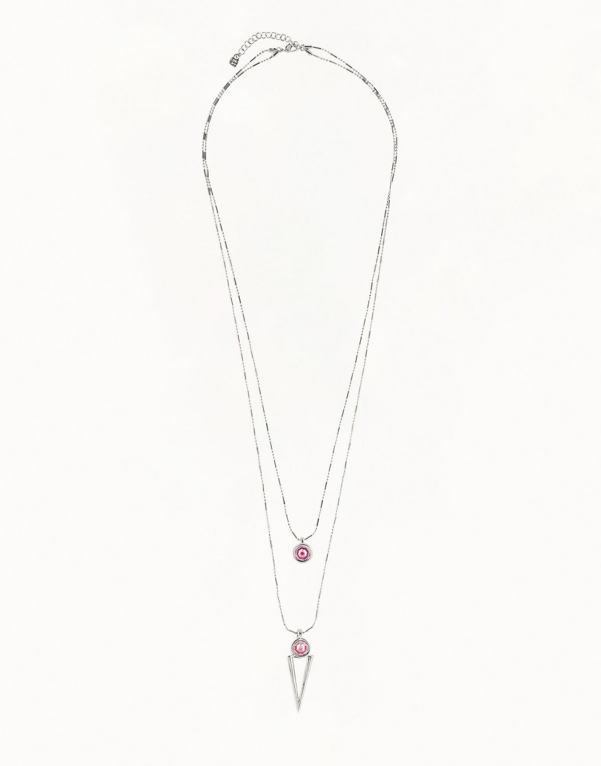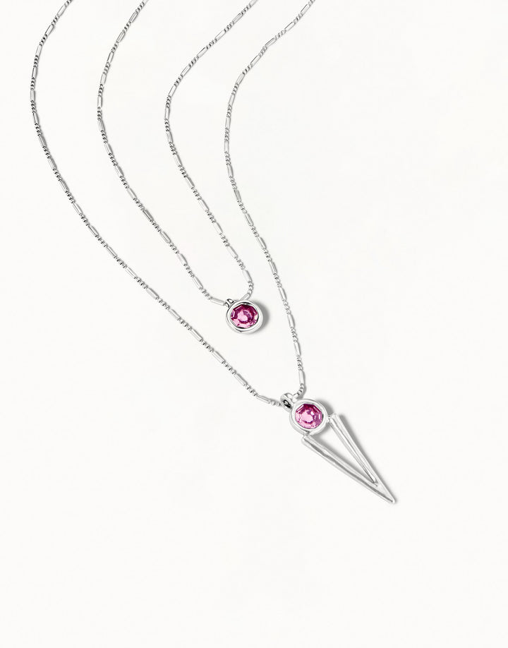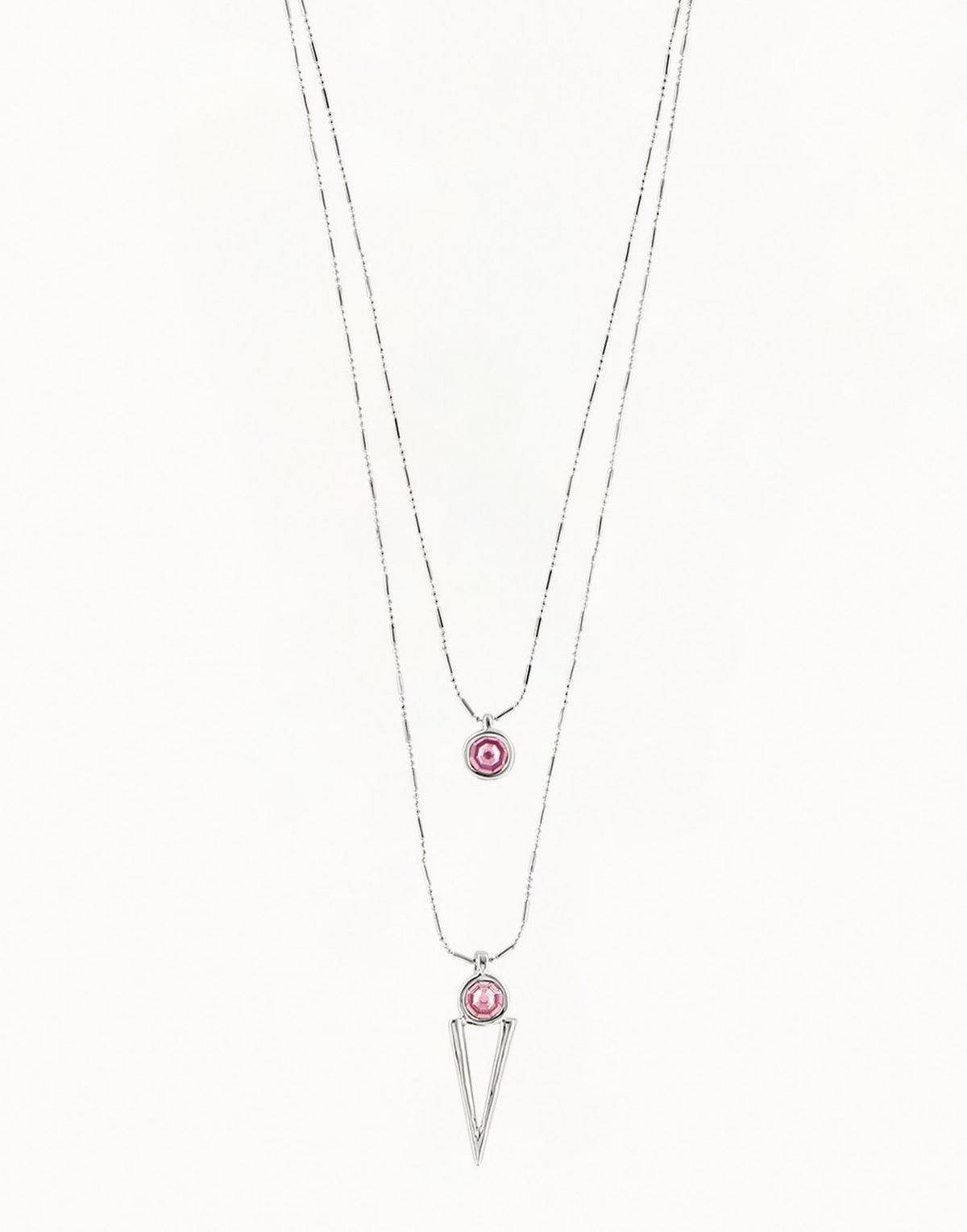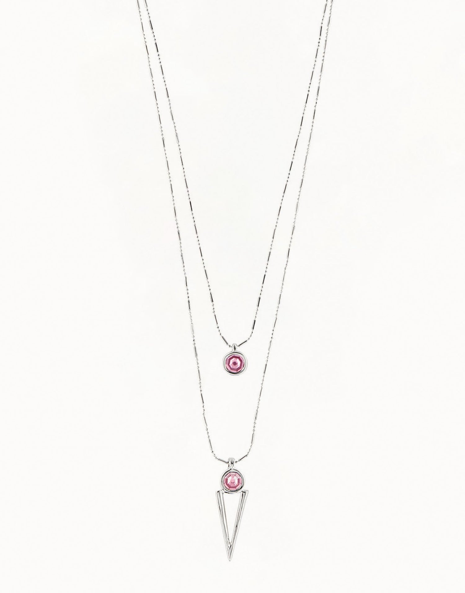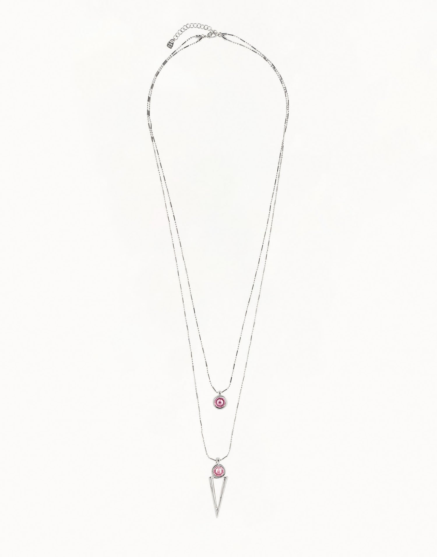 This My Way Necklace by UNOde50 features two delicate double chains of silver-plated metal, accented by triangular and round charms with a pink faceted crystal. Handmade in Spain, it embodies geometric harmony, elegance, and subtle magnetism. Perfect for layering or wearing alone, it adds a refined and playful touch to everyday outfits. Its lightweight, versatile design reflects UNOde50’s artisanal craftsmanship and dedication to creating contemporary, high-quality jewelry. This necklace balances sophistication with modern charm, offering a unique accessory that celebrates individuality, personal style, and the artistry inherent in meticulously handcrafted Spanish jewelry.