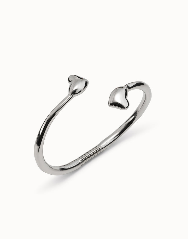 This Mutual Love Bracelet by UNOde50 showcases an open design featuring two hearts on either end, symbolizing connection and affection. Handmade in Spain, it combines silver-plated metal alloy craftsmanship with a spring for adjustable comfort, weighing 17 g. Perfect for stacking or wearing solo, it conveys elegance, sentimentality, and contemporary sophistication. Its design balances delicate symbolism with bold, modern lines, reflecting UNOde50’s dedication to high-quality, handcrafted jewelry that merges meaningful expression with versatility and stylish appeal. This piece is ideal as an everyday essential or a memorable gift for loved ones.