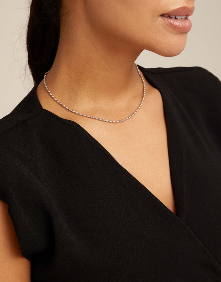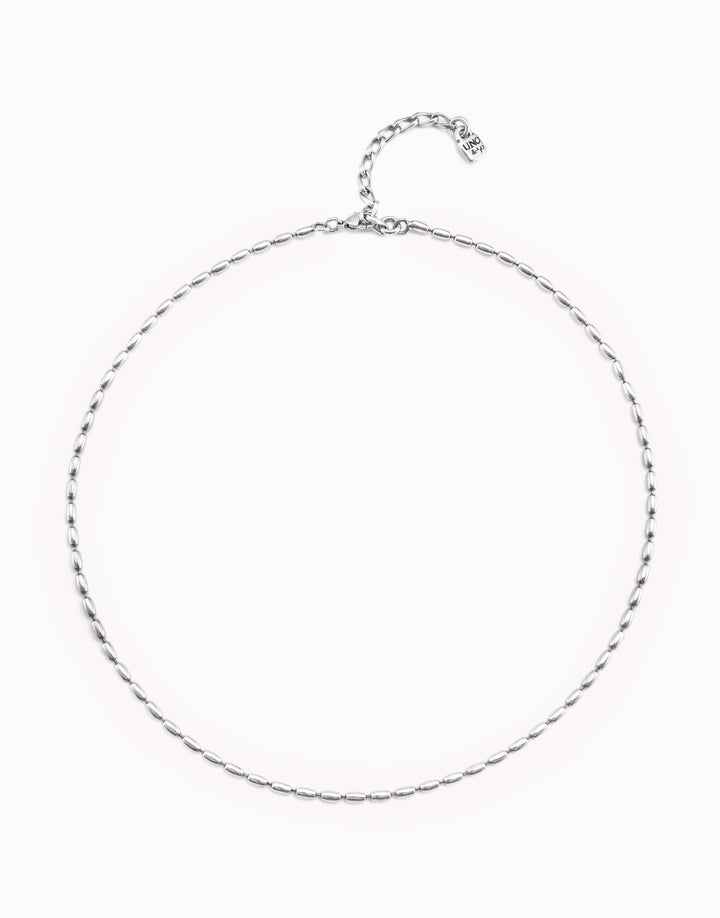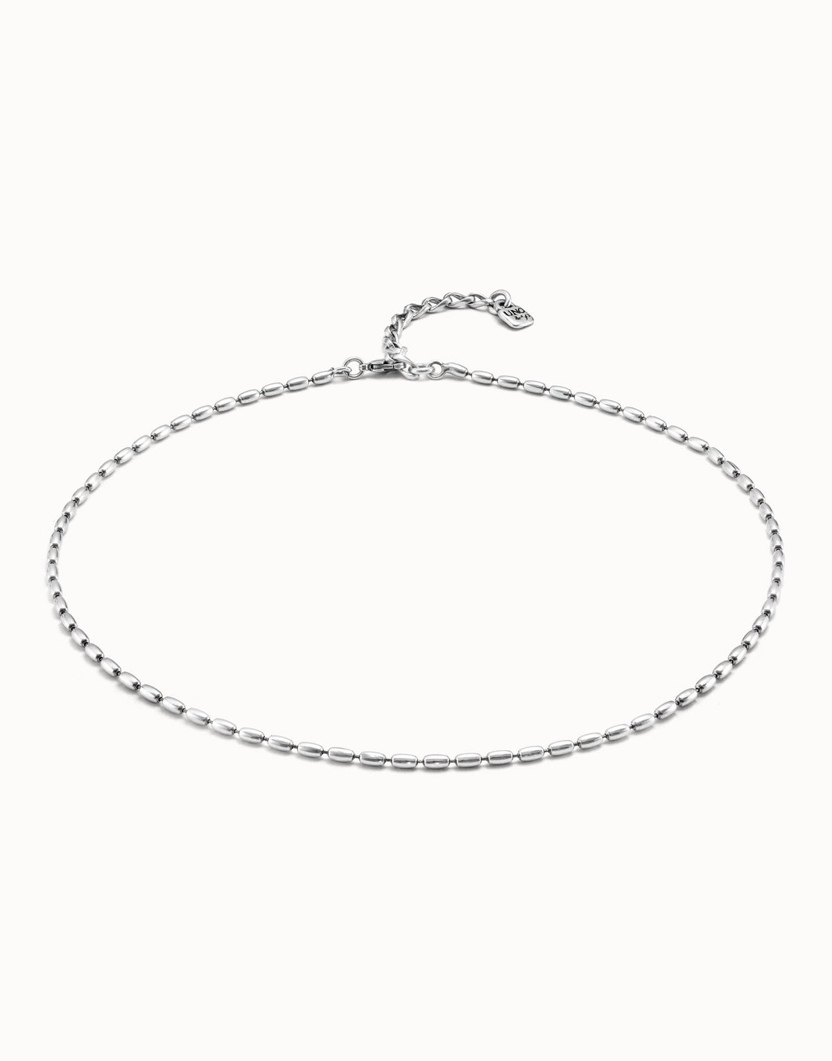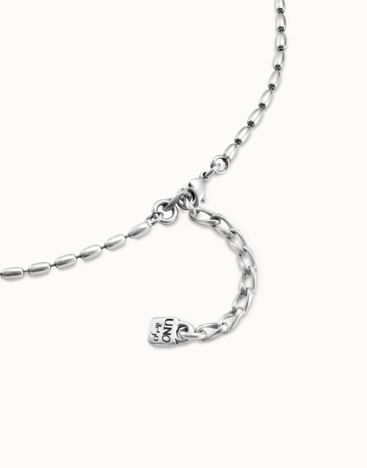 Handcrafted in sterling silver-plated metal. Short length type. Minimum length: 40 cm, maximum length: 44.5 cm. Adjustable carabiner clasp. 100% handmade in Spain.