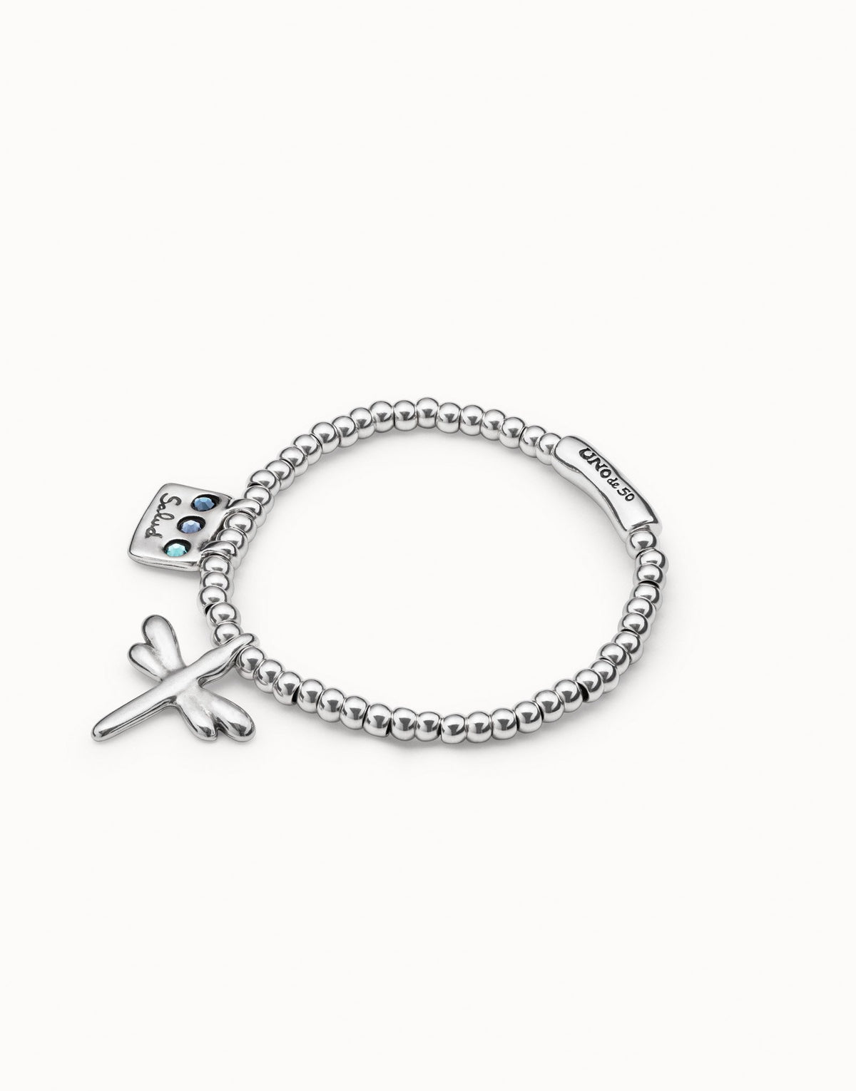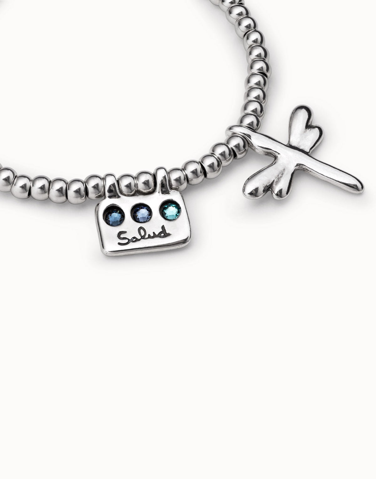 This Beaded Stretch Bracelet with a Dragonfly Charm by UNOde50 features XS-length elastic sterling silver-plated beads with two symbolic charms: a dragonfly and a “health” charm, accented with three blue Swarovski crystals. Handmade in Spain, it conveys artisanal craftsmanship, contemporary elegance, and meaningful design. Ideal for stacking or solo wear, the bracelet balances playful charm with sophistication. Its polished beads and sparkling crystals reflect light beautifully, highlighting UNOde50’s attention to detail and high-quality handcrafted jewelry. A versatile accessory, it embodies creativity, individuality, and wearable artistry for style-conscious wearers.