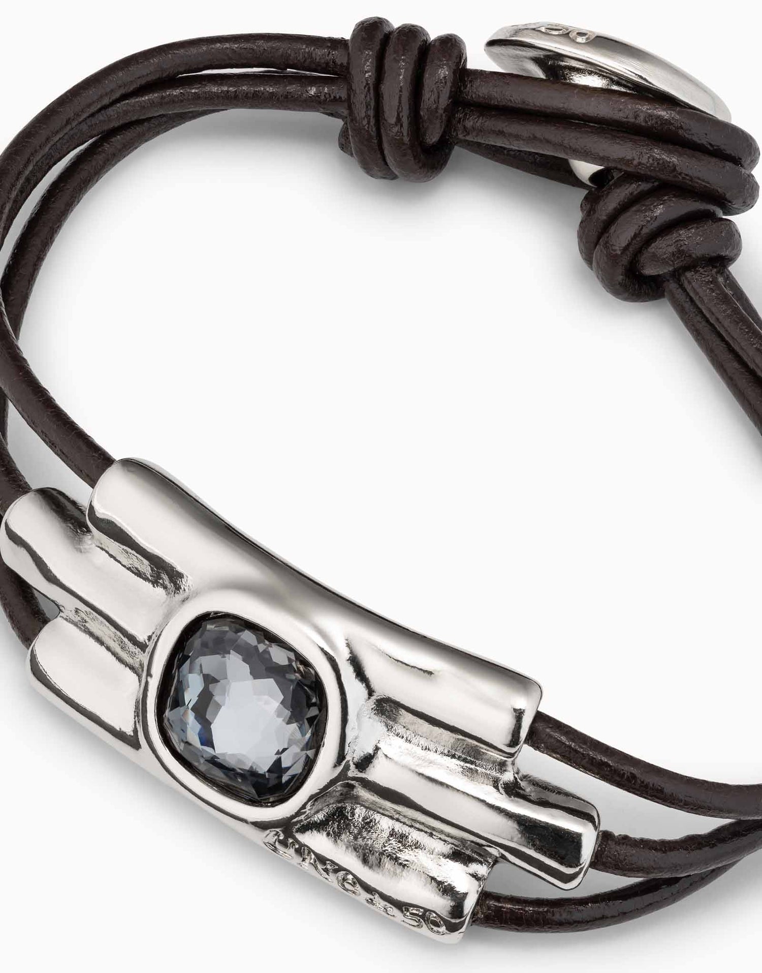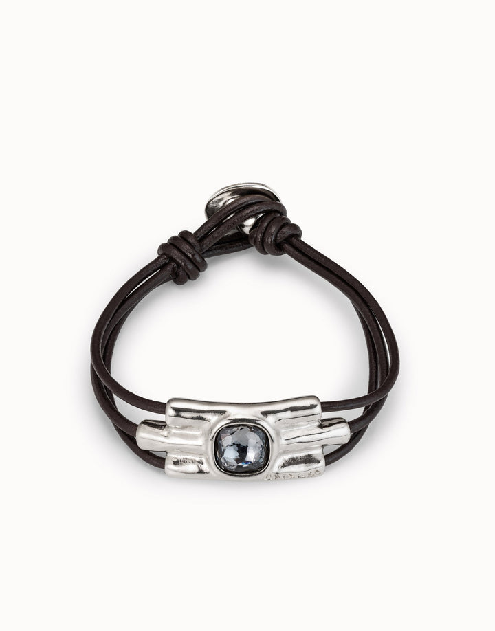 Handcrafted in sterling silver-plated metal with leather and a gray faceted stone. XS length type. Minimum perimeter: 15.7 cm, maximum perimeter with extender: 18 cm. Toggle clasp. 100% handmade in Spain.