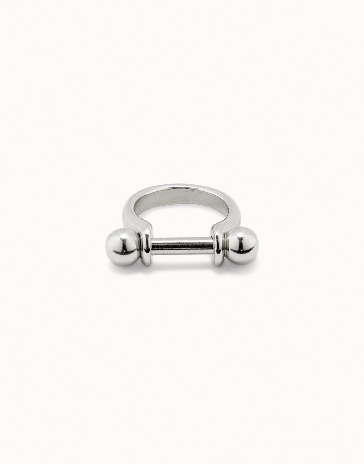 This Charm Ring by UNOde50 features a sterling silver-plated band with a central cylindrical piece for hanging charms, accented with two side balls. Handmade in Spain, it embodies versatility, artisanal craftsmanship, and modern elegance. Ideal for stacking or wearing alone, the ring conveys individuality and contemporary style. Its refined design allows personalization with favorite charms, reflecting UNOde50’s commitment to high-quality, handcrafted jewelry. This piece balances functionality with aesthetic appeal, offering a timeless, statement accessory suitable for daily wear or special occasions.