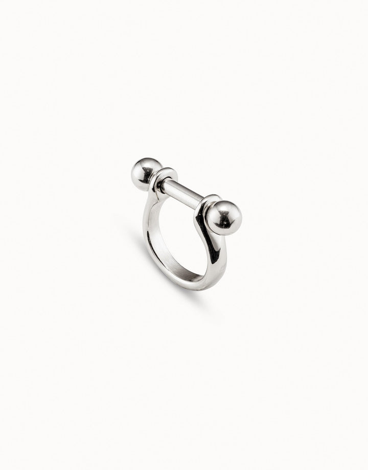 This Charm Ring by UNOde50 features a sterling silver-plated band with a central cylindrical piece for charms, accented with two side balls. Handmade in Spain, it embodies contemporary style, versatility, and artisanal craftsmanship. Ideal for stacking or wearing alone, the ring allows personalization with favorite charms while showcasing polished finish and refined design. This piece reflects UNOde50’s commitment to high-quality handcrafted jewelry that balances modern aesthetics, wearable artistry, and expressive style, making it a standout, versatile accessory for daily wear or special occasions.