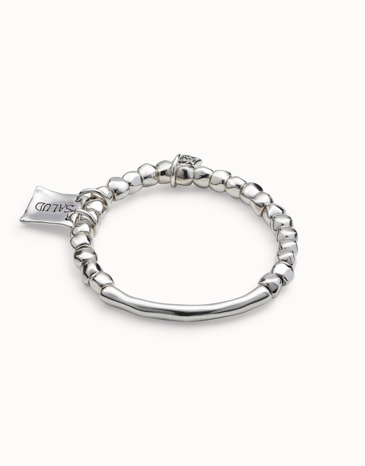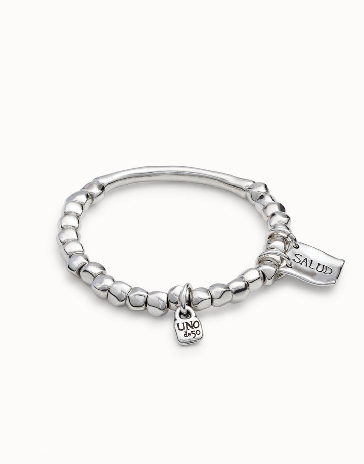This Beaded Stretch Bracelet with Tubular Piece and Charms by UNOde50 features sterling silver-plated beads and a tubular central piece, handcrafted in Spain. Long length type provides versatile styling options and a comfortable fit. Ideal for stacking or wearing alone, it conveys contemporary elegance, artisanal craftsmanship, and expressive design. Its polished finish and refined detailing highlight UNOde50’s commitment to high-quality, handcrafted jewelry. The bracelet balances modern aesthetics, symbolic charm, and wearable sophistication, making it a statement accessory suitable for daily wear or special occasions.