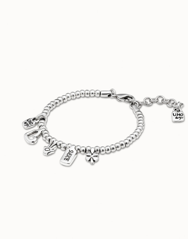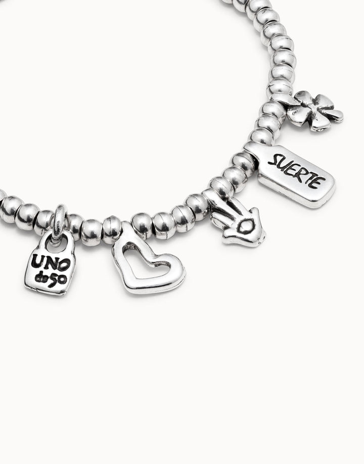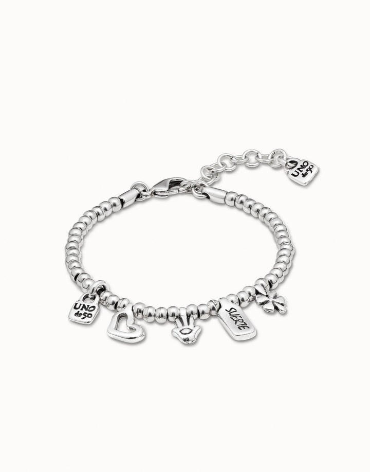 This Beaded Bracelet with Charms by UNOde50 features sterling silver-plated beads with pearly accents and four symbolic charms: a heart, clover, padlock, and hand. Handmade in Spain, it embodies expressive style, artisanal craftsmanship, and contemporary elegance. Long length type ensures comfortable wear, while the polished finish enhances versatility. Perfect for stacking or solo wear, the bracelet conveys wearable artistry, charm, and meaningful symbolism. This piece reflects UNOde50’s commitment to high-quality handmade jewelry, combining refined design, expressive details, and versatile styling for modern, fashion-conscious wearers.