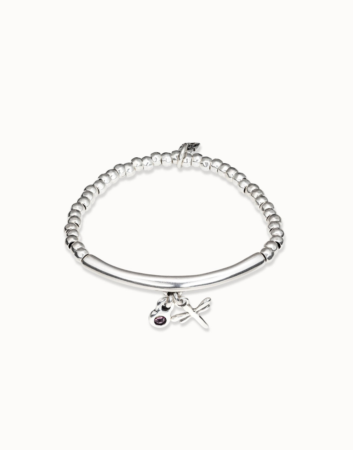 This Drag Me Fly Bracelet by UNOde50 features elastic sterling silver-plated beads with a dragonfly charm and purple faceted crystal, handcrafted in Spain. Small length type ensures comfortable fit and versatile styling. Perfect for layering or solo wear, the bracelet conveys artisanal craftsmanship, contemporary elegance, and playful charm. Its polished finish and symbolic detailing make it a statement accessory suitable for everyday or special occasions. This piece reflects UNOde50’s dedication to high-quality handmade jewelry that merges expressive design, wearable artistry, and symbolic meaning.