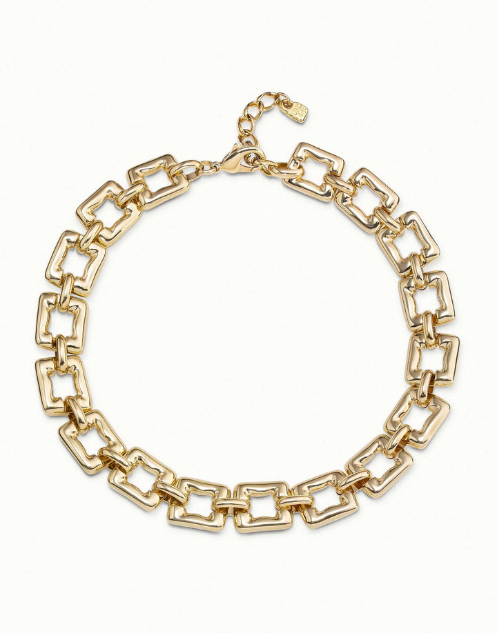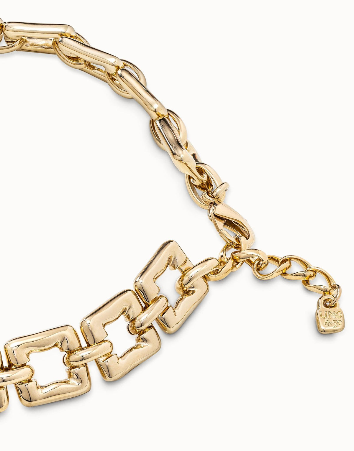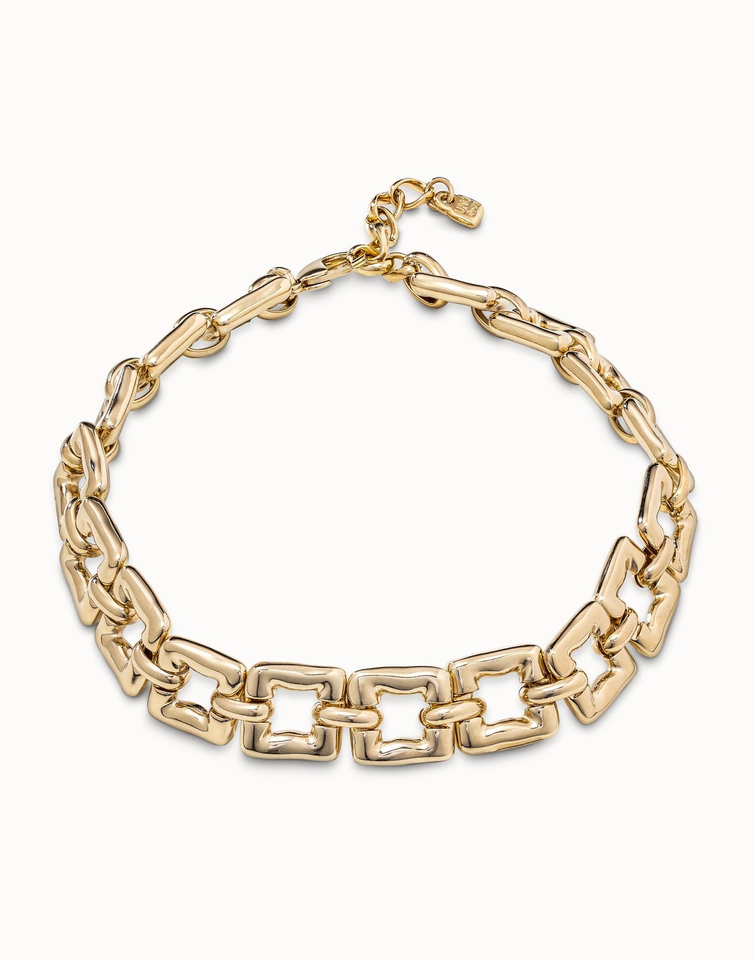This Necklace Lolita by UNOde50 is a sophisticated, short statement necklace that exudes contemporary elegance. Handmade in Spain from gold-plated metal alloy, it features large, squared links and a lobster clasp for adjustable length between 11.5–13.5 cm, fitting comfortably for layered styling. Part of the Magnetic collection, it captures bold, architectural design and artisanal craftsmanship. Ideal for pairing with other collection pieces, the necklace transforms any outfit into a refined, one-of-a-kind look, balancing modern luxury with expressive, handcrafted artistry.