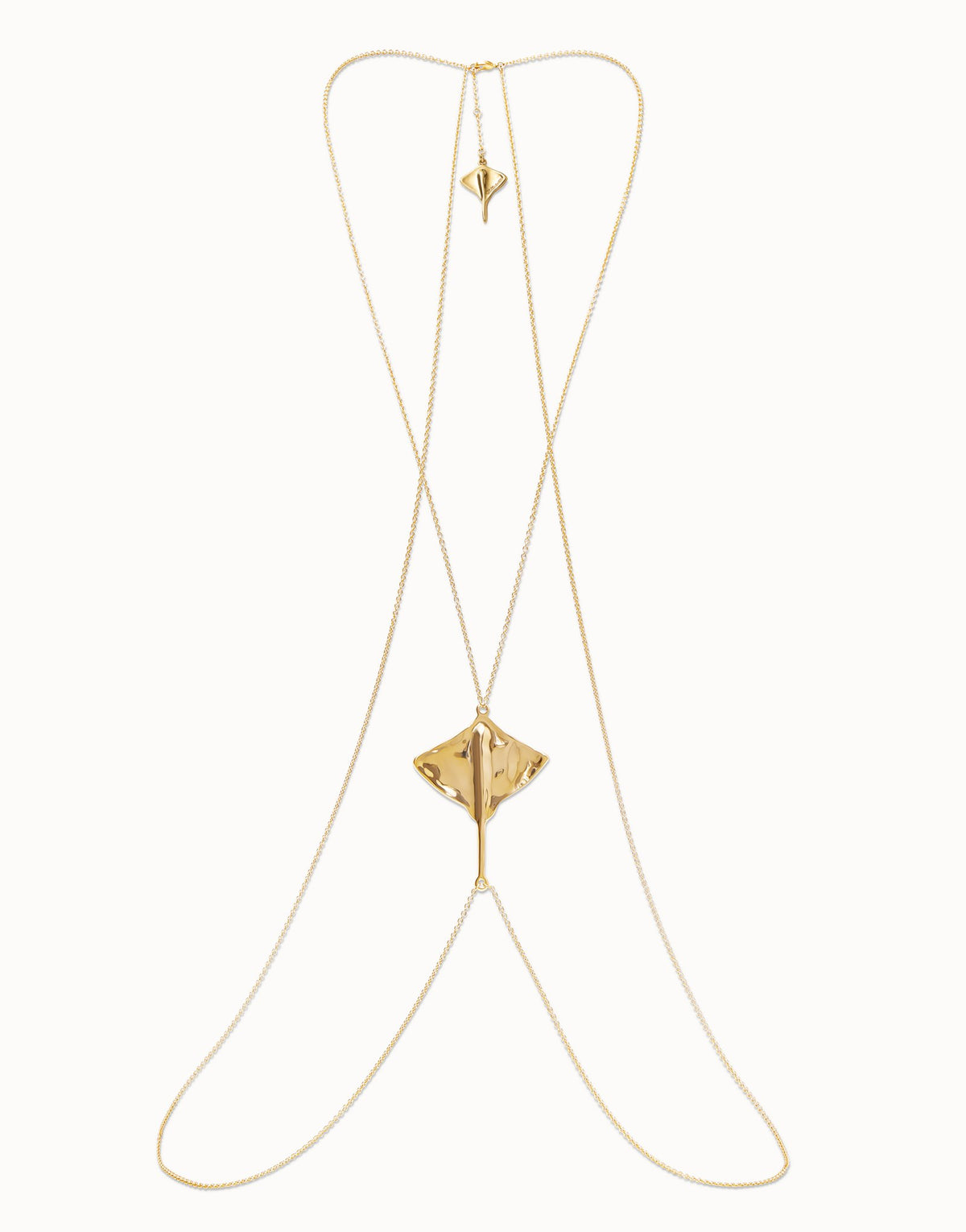 This Body Chain with Manta Ray by UNOde50 is a striking, artisanal accessory that embodies grace, freedom, and majesty. Handmade in Spain with 18k gold plating, the pendant features a detailed manta ray, representing the indomitable spirit of Puerto Rico and the Ser Majestuosa collection. Its 61 cm length allows it to drape elegantly on the body, creating a statement look. Each piece showcases meticulous craftsmanship, transforming a symbolic motif into a wearable work of art, combining cultural significance, contemporary design, and high-quality, handcrafted luxury for a sophisticated, bold accessory.