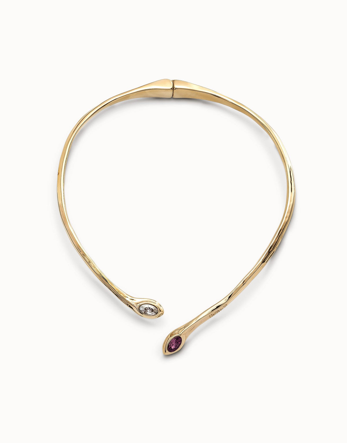 This handcrafted short necklace is made in Spain from an 18k gold-plated metal alloy. It has a concealed spring and features a white and a wine-colored faceted crystal at each end, with a minimum length of 37 cm.