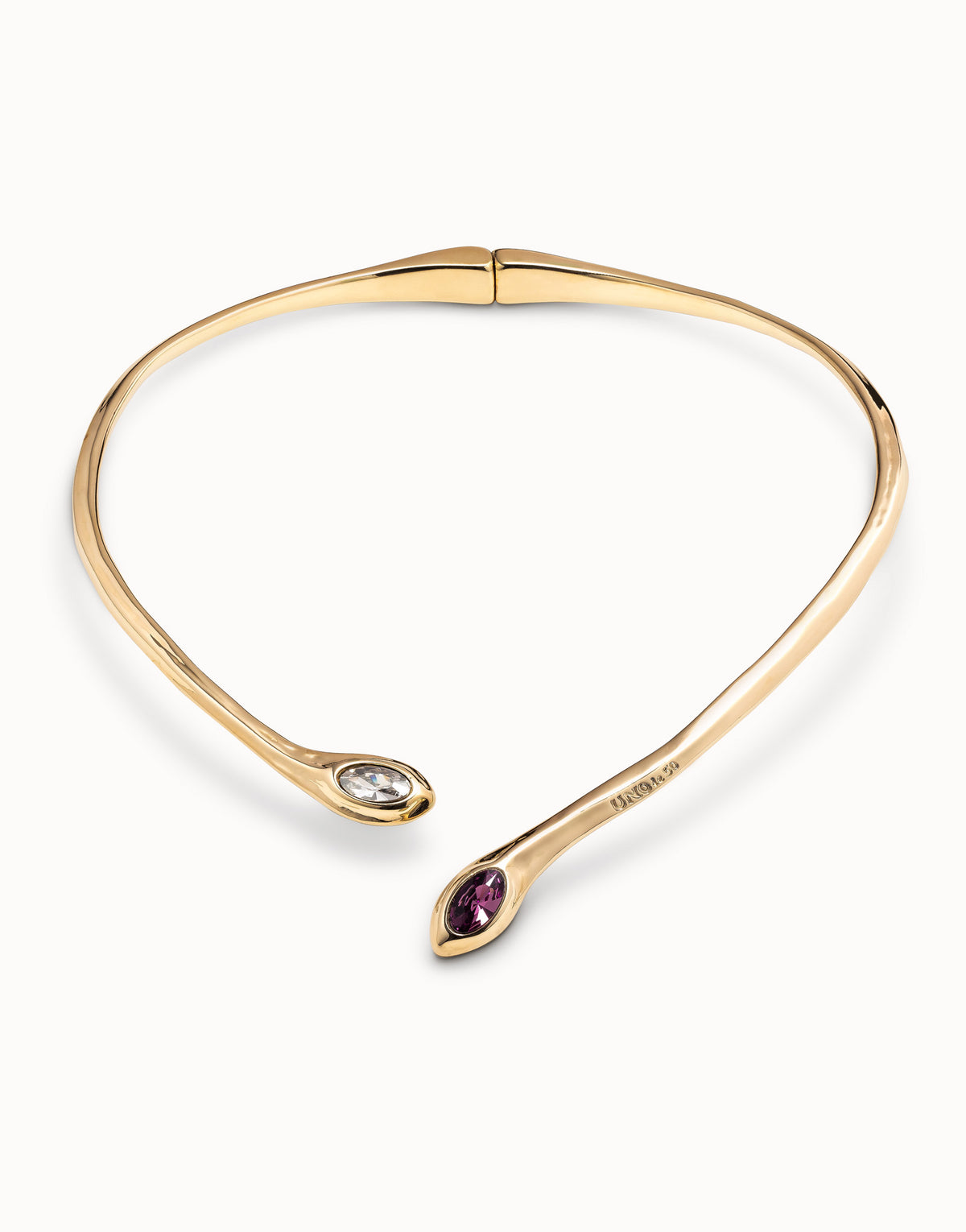 This Spring necklace by UNOde50 is an expressive and modern piece that features two contrasting crystals. The solid, short necklace design has a beautiful, sculptural feel, while the wine-colored and white crystals at each end create a captivating visual tension. This necklace symbolizes duality and a playful elegance. It is an artistic accessory for the person who appreciates unique, handcrafted designs and wants to add a bold and personal touch to their style.