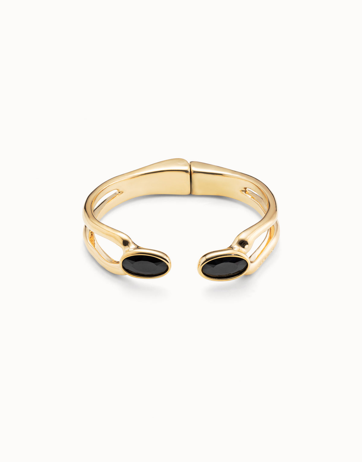 This handcrafted open bracelet is made in Spain from 18k gold-plated cast metal. It has a minimum perimeter of 16 cm and features a chandelier component link with a black faceted crystal at each end.