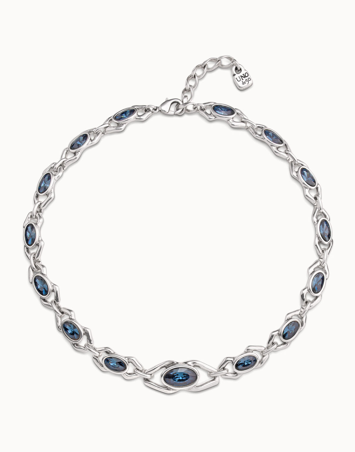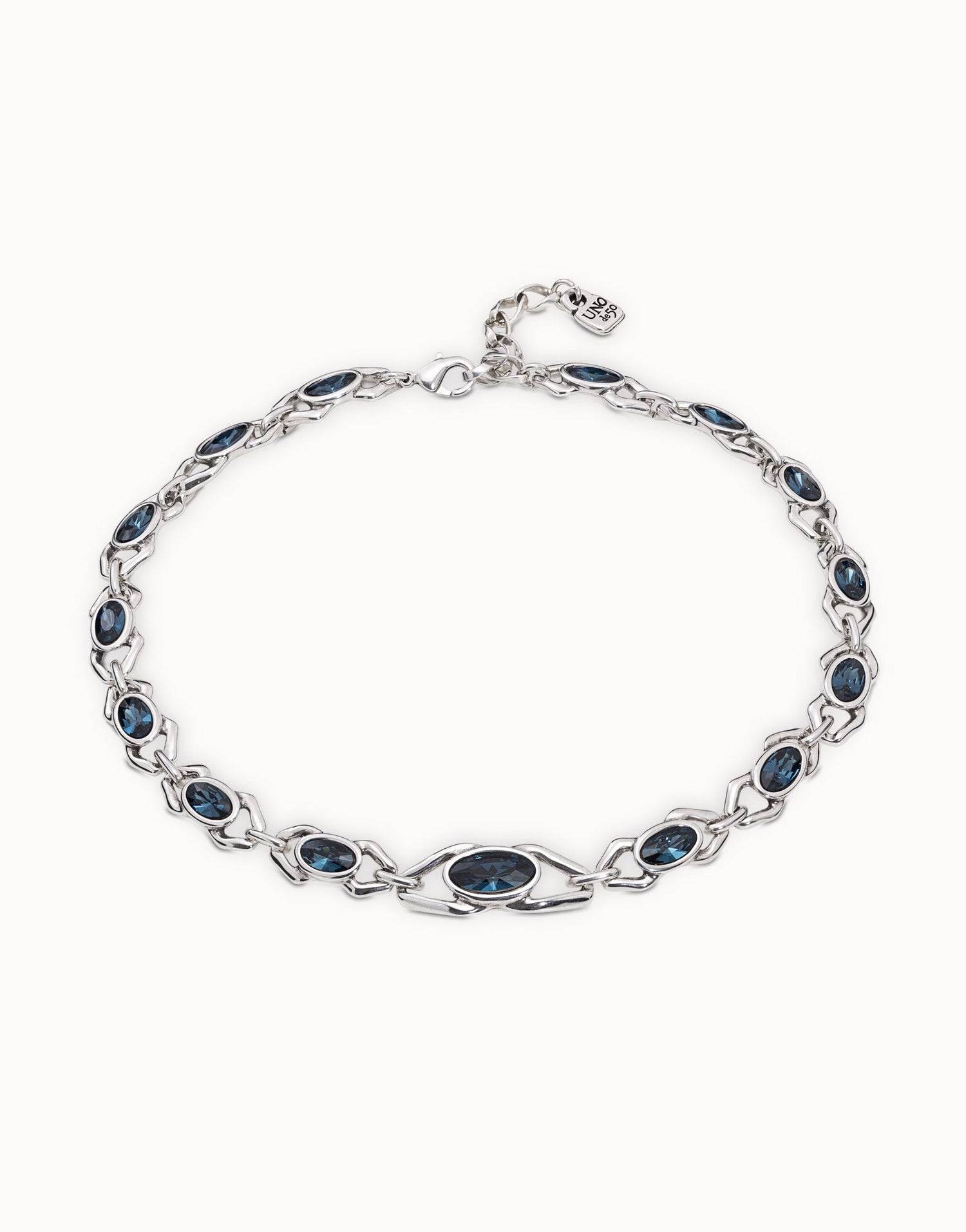 This Madame necklace by UNOde50 is a captivating and elegant statement piece. It features fourteen small chandelier links, each set with a vibrant blue crystal, creating a continuous line of luxurious sparkle. This necklace symbolizes grace and sophisticated style. The rich blue crystals contrast beautifully with the metal, making it a perfect accessory for someone who embraces a high-impact, glamorous aesthetic. It is ideal for adding a touch of refined drama to any special occasion.