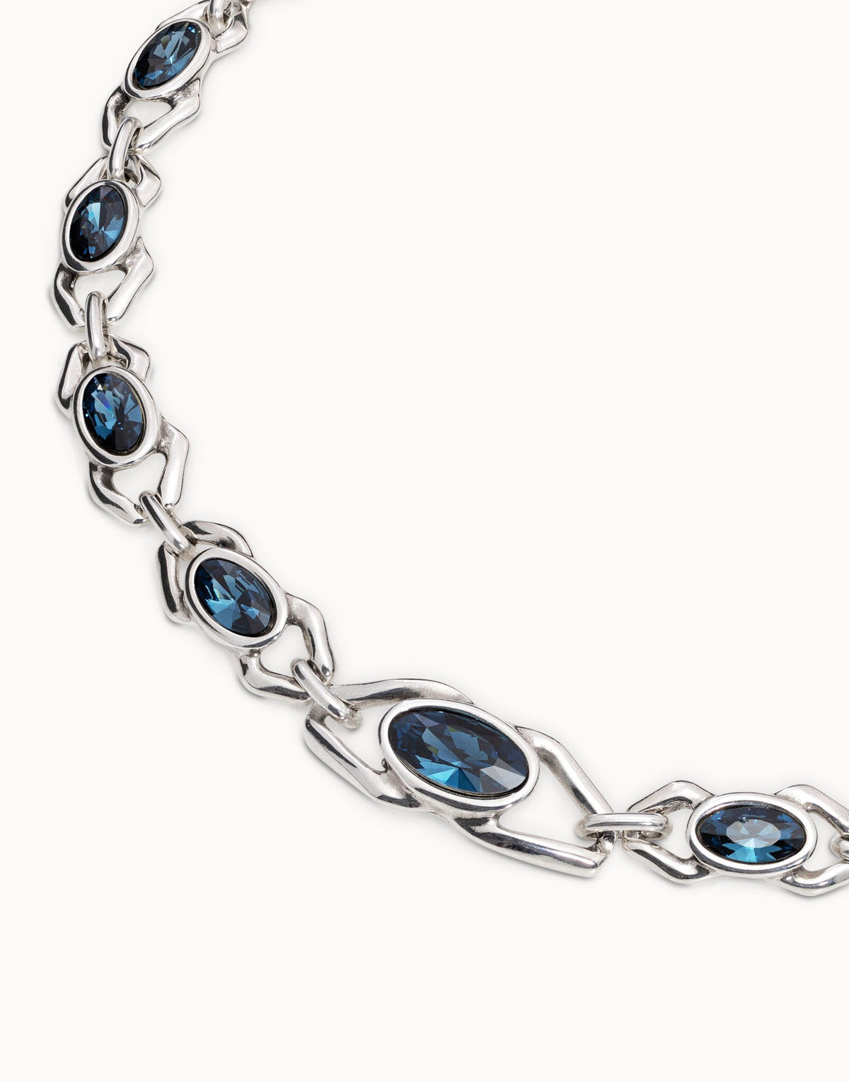 This handcrafted short necklace is made in Spain from a silver-plated metal alloy, featuring fourteen small chandelier links with a faceted blue crystal. It has an adjustable lobster clasp with a minimum length of 39.5 cm and a maximum length of 44 cm.