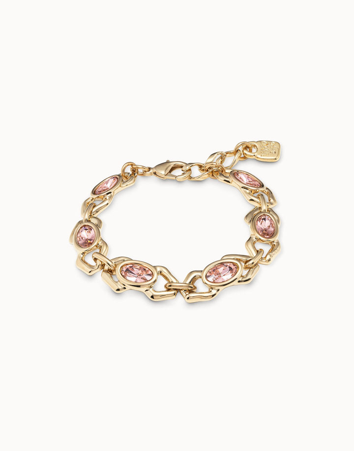 This handcrafted bracelet is made in Spain from an 18k gold-plated metal alloy, featuring six faceted salmon-colored crystal component links. This is the XS size, with a minimum perimeter of 16 cm and a maximum perimeter of 18 cm. It also includes an extender for a maximum perimeter of 21 cm.