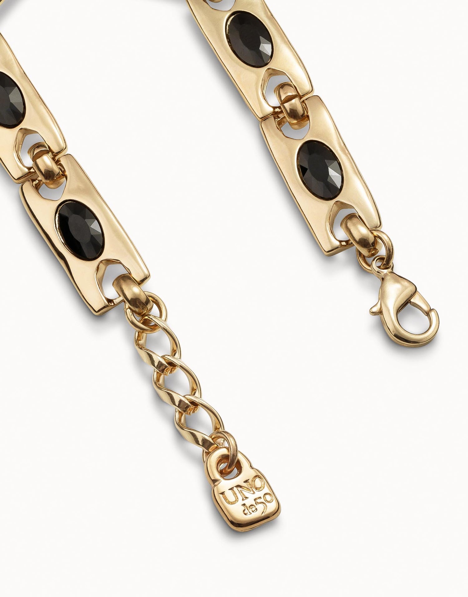 This handcrafted bracelet is made in Spain from an 18k gold-plated metal alloy, featuring six faceted black crystal component links. This is a Medium size, with a minimum perimeter of 17 cm and a maximum perimeter of 18.5 cm. It also includes an extender for a maximum perimeter of 21.5 cm.