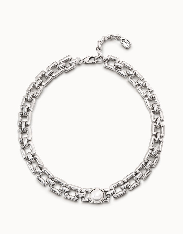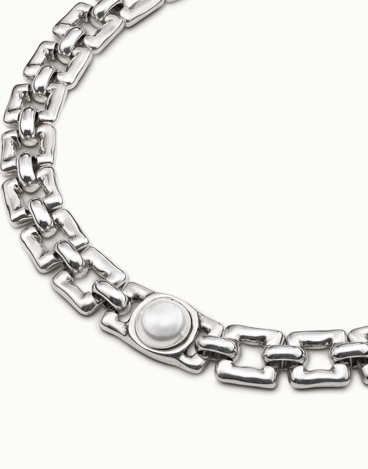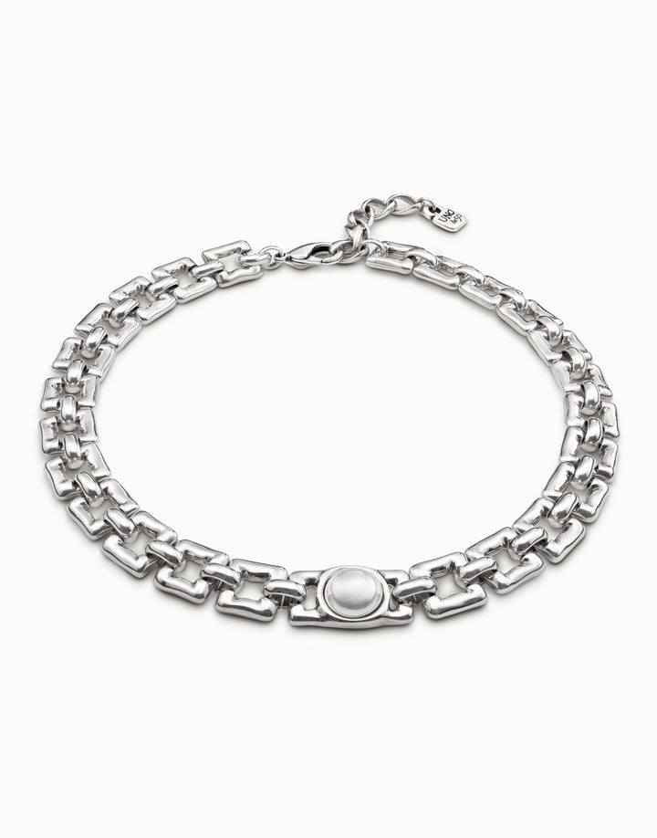 This handcrafted short necklace is made in Spain from a silver-plated metal alloy. It features small, squared links and a central shell pearl. It has an adjustable lobster clasp with a minimum length of 38 cm and a maximum length of 42 cm.